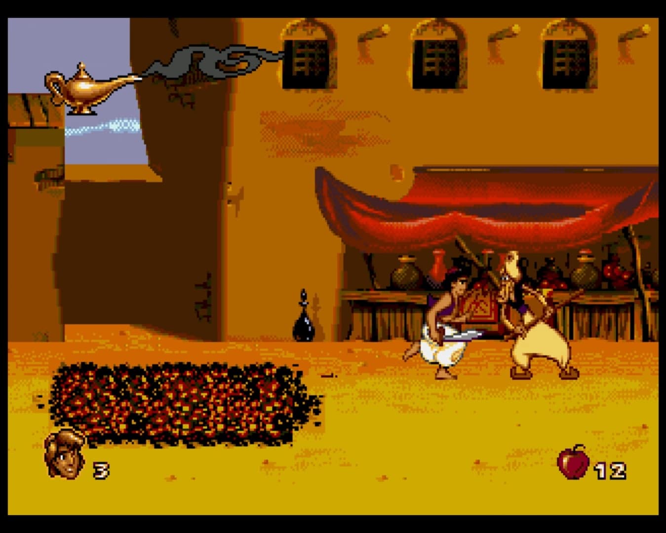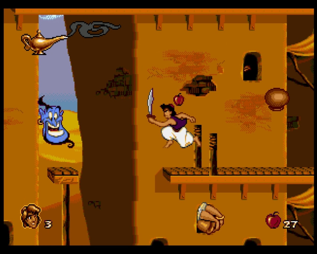 Aladdin on sivuttain vierivä tasohyppelypeli, joka mukailee karkeasti elokuvan tarinaa. Ensimmäisessä kentässä pelaaja ohjastaa Aladdinia tämän paetessa Agrabahin vartijoita kaduilla ja katoilla, ja tämä ensimmäinen kenttä onkin se, mistä peli muistetaan – puhtaasti sen takia, että moni pelaaja ei ikinä päässyt sitä pitemmälle. Työskentelin itse pelin ilmestymisen aikoihin paikallisessa peliliikkeessä, ja muistan vieläkin elävästi, miten moni lapselleen Aladdinin ostanut vanhempi saapui paria päivää myöhemmin palauttamaan peliä, koska lapset olivat turhautuneet sen parissa niin totaalisesti, ettei sitä haluttu enää pelata. Enkä syytä lapsia!