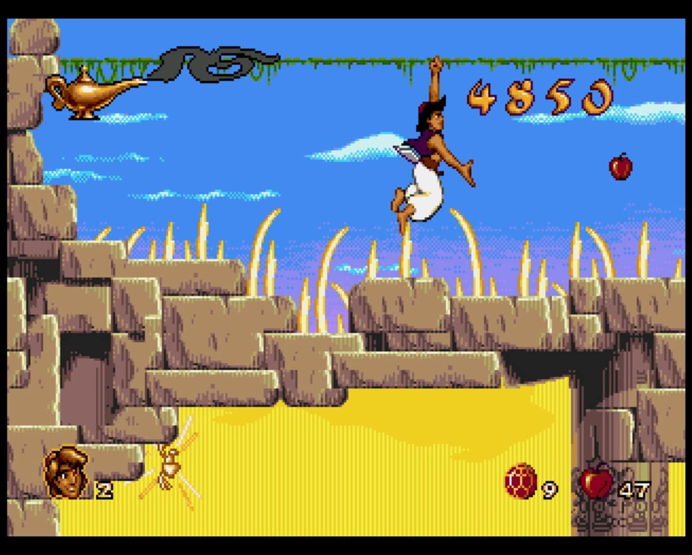 Koska en itse ollut paikalla, en voi tietenkään sanoa mitään varmaa asiasta, mutta tuntuu kovasti siltä, kuin tämä kiire olisi vaikuttanut lopputuloksen laatuun. 31 vuotta myöhemmin Aladdin nimittäin muistetaan erityisesti yhdestä jutusta: järkyttävästä vaikeustasostaan.