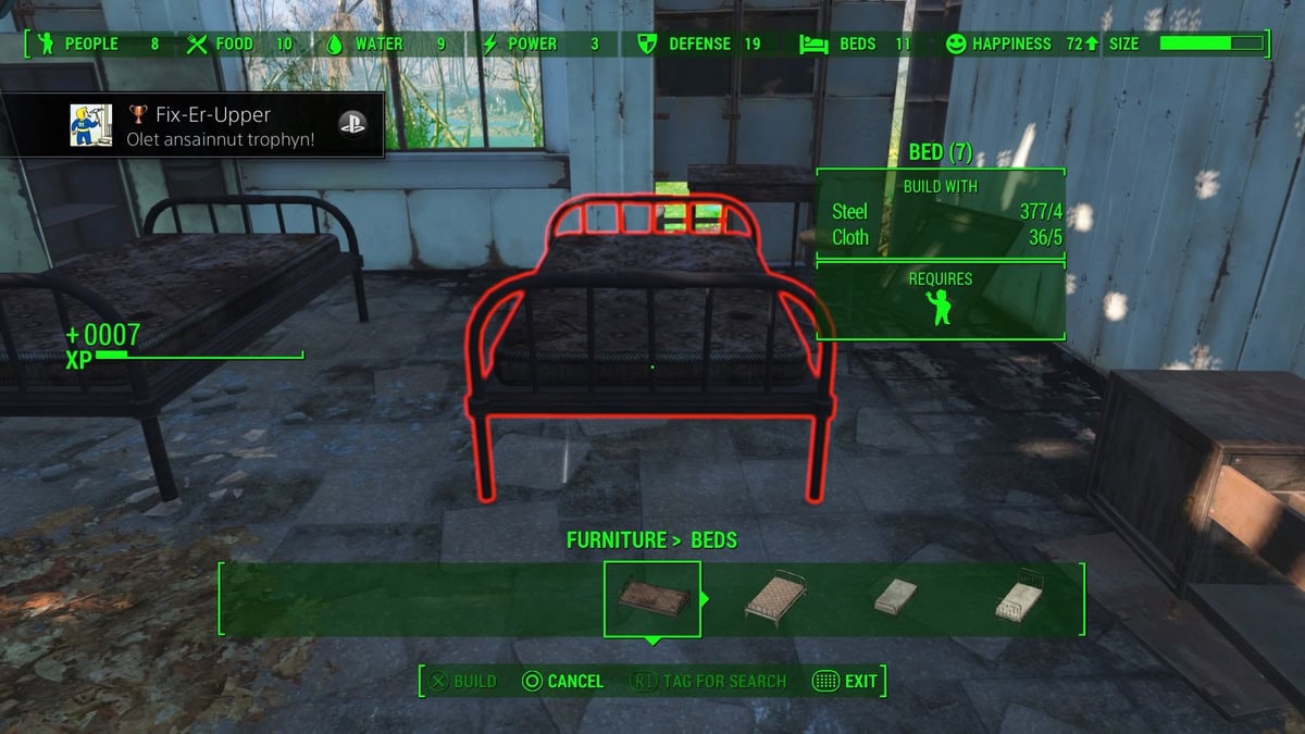 Jo alussa päästään testaamaan uutta Minecraft-henkistä rakentelutilaa, jossa asetellaan omalle puolelle houkuteltuihin kyliin ja asutuksiin huonekaluja, peltoja ja jopa kokonaisia rakennuksia. Se on täysin valinnainen osa peliä, vaatii paljon työtä vähäiseen hyötyynsä nähden. Jos olet roolipelaaja, joka haluaa tunnelmoida muuttamalla rauniot sähkövalaistuksi lomakyläksi, rakenteluun voi kuitenkin upottaa kokonaisia iltoja. Tärkein perk tähän puuhaan on 6 pisteen CHA-arvon vaativa Local Leader, jota ilman tavaranrahtaus pitäjästä toiseen käy rasittavaksi. Parhaat sähkölaitteet vaativat myös perkkejä Science! (INT 6) ja Hacker (Int 4).