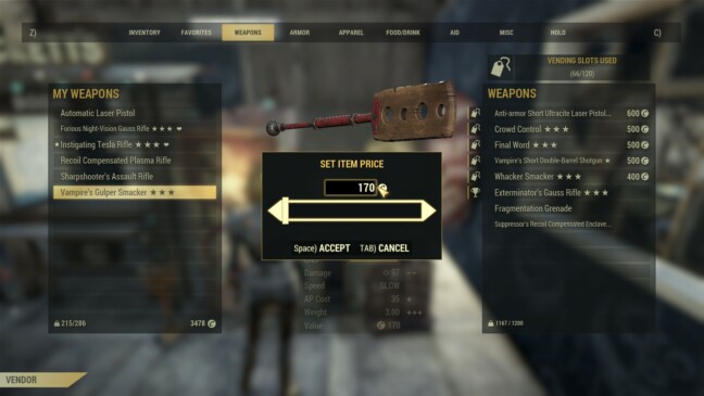 Myöhemmin sillä voi ostaa uusia ja omaa pelityyliäsi varten räätälöityjä legendary-varusteita erikoiskauppiaalta. Sama tyyppi myös myy moduuleja, joilla voi rakentaa omia legendaryja. Niinpä kaikki scripatut esineet ovat kirjaimellisesti rahaa pankkiin tulevaisuutta varten.