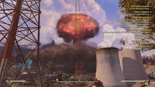 Sen sijaan pommeja käytetään laukaisemaan tiettyjä erityistehtäviä, kuten supermutanttipomon metsästys hylätyssä kaivoksessa tai Scorchbeast-kuningattaren lahtaus kartan kaakkoisnurkassa. Jos satut talsimaan alueella, johon pommia on tulossa, kannattaa siis rynnätä tuhoalueen ulkolaidalle ja ihailla ilotulitusta.