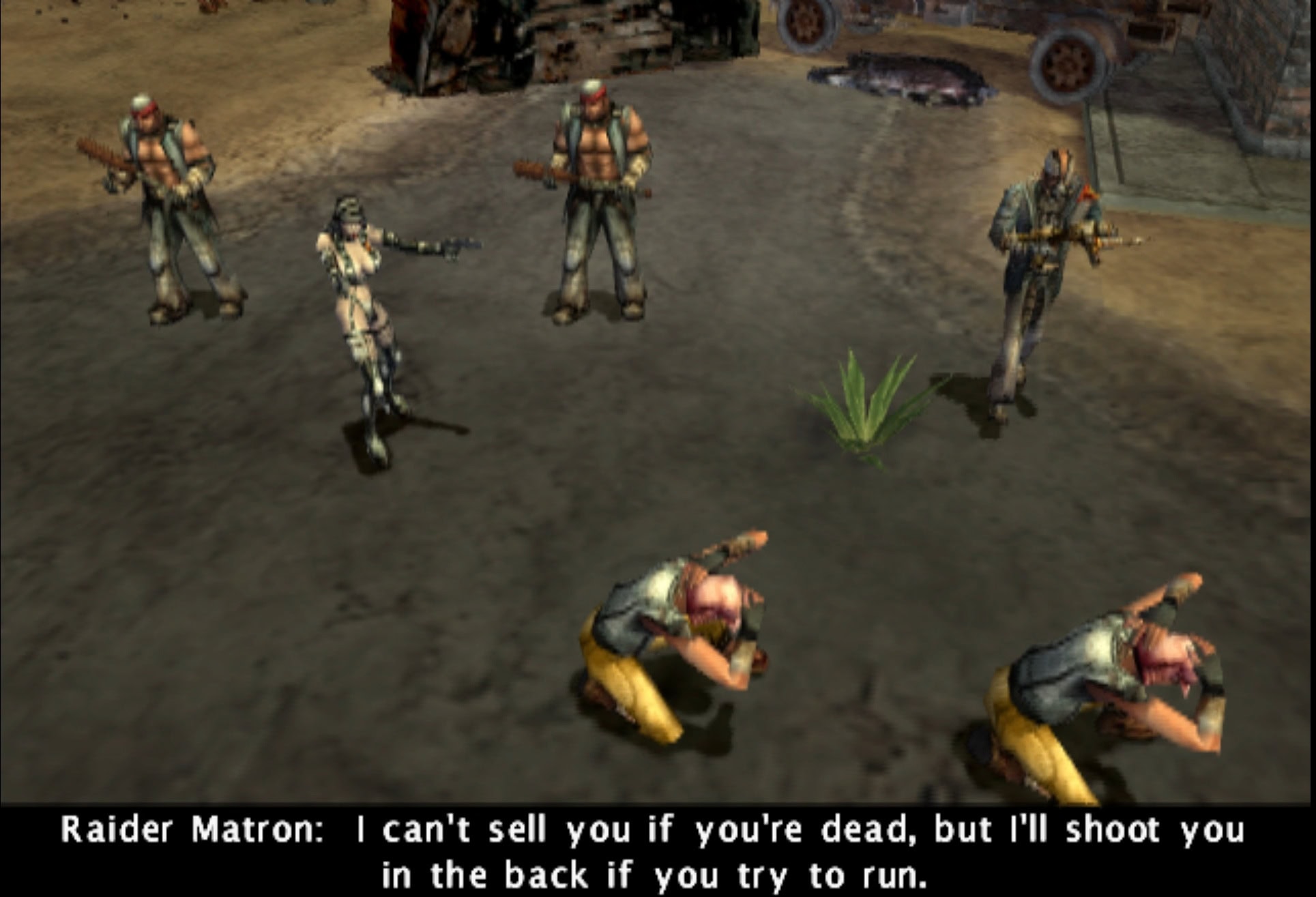 Karmeaa pelattavuutta ikävämpää on se, että pelin kehittäjät eivät todellakaan ole tajunneet Falloutia tai niiden tyyliä. Niiden alkuperäisten pelien suuri viehätys oli, että ne oli kirjoitettu niin älyttömän hyvin. Pelit olivat täynnä hyviä hahmoja, viihdyttävää dialogia, sopivan synkeää huumoria ja puhdasta luomisen iloa. Nyt meno on kuin jostain lauantaiaamun piirretystä, mutta koska kyseessä on aikuisille suunnattu peli, paperinohuet hahmot sanovat joka välissä kirosanoja ja ensimmäisen suuremman tarinaosion pahis, bandiitteja johtava roistokuningatar, on pukeutunut niukkaan sadomaso-henkiseen nahka-asuun.