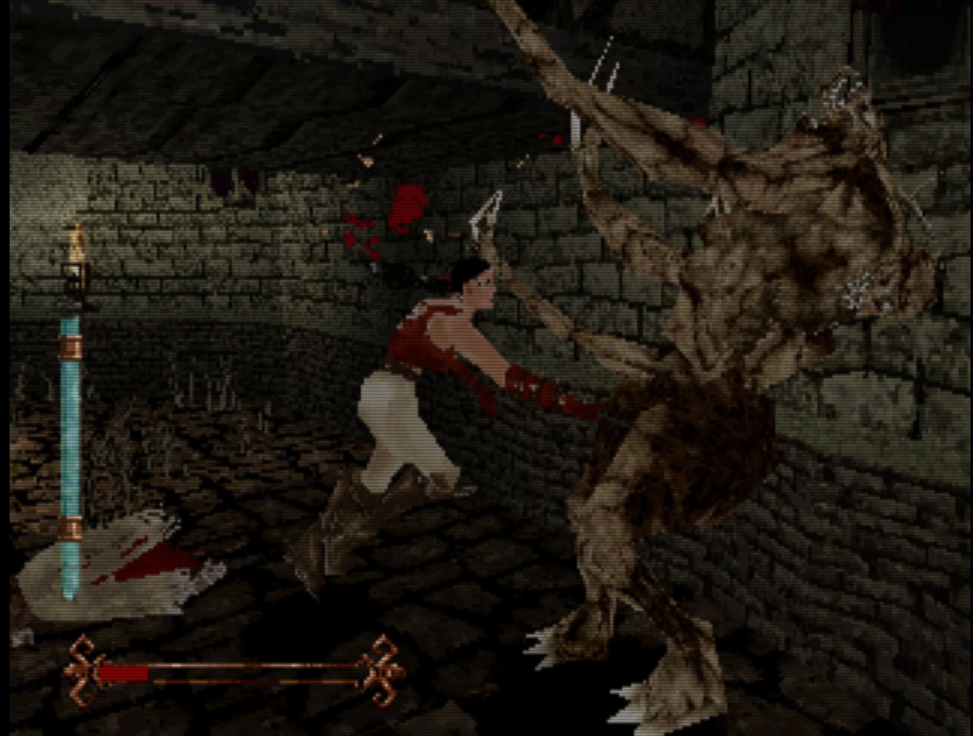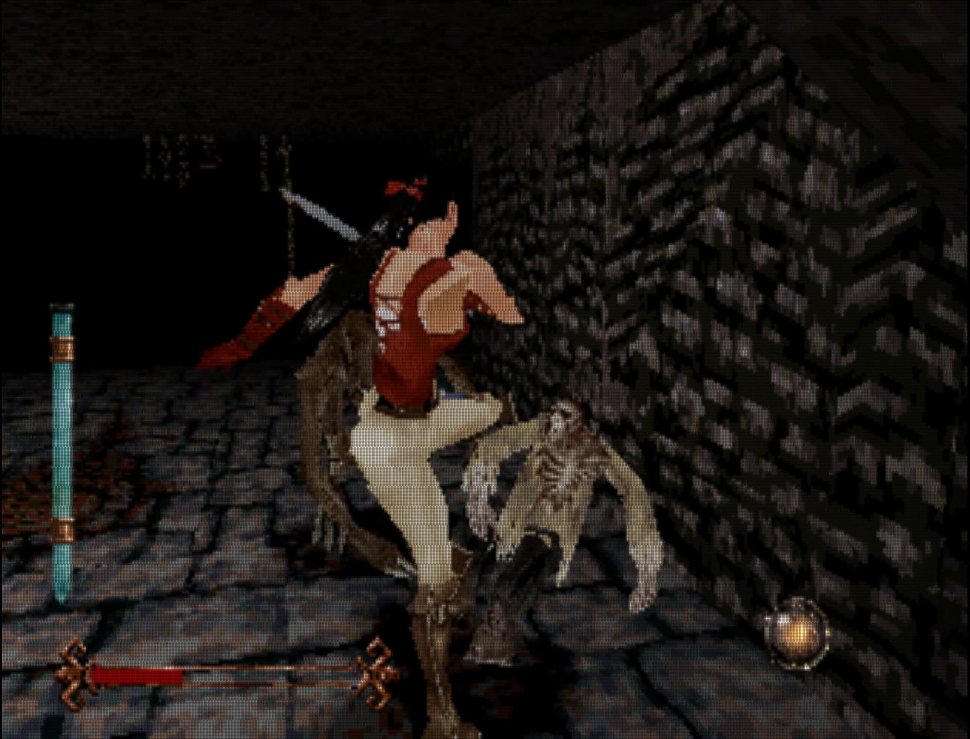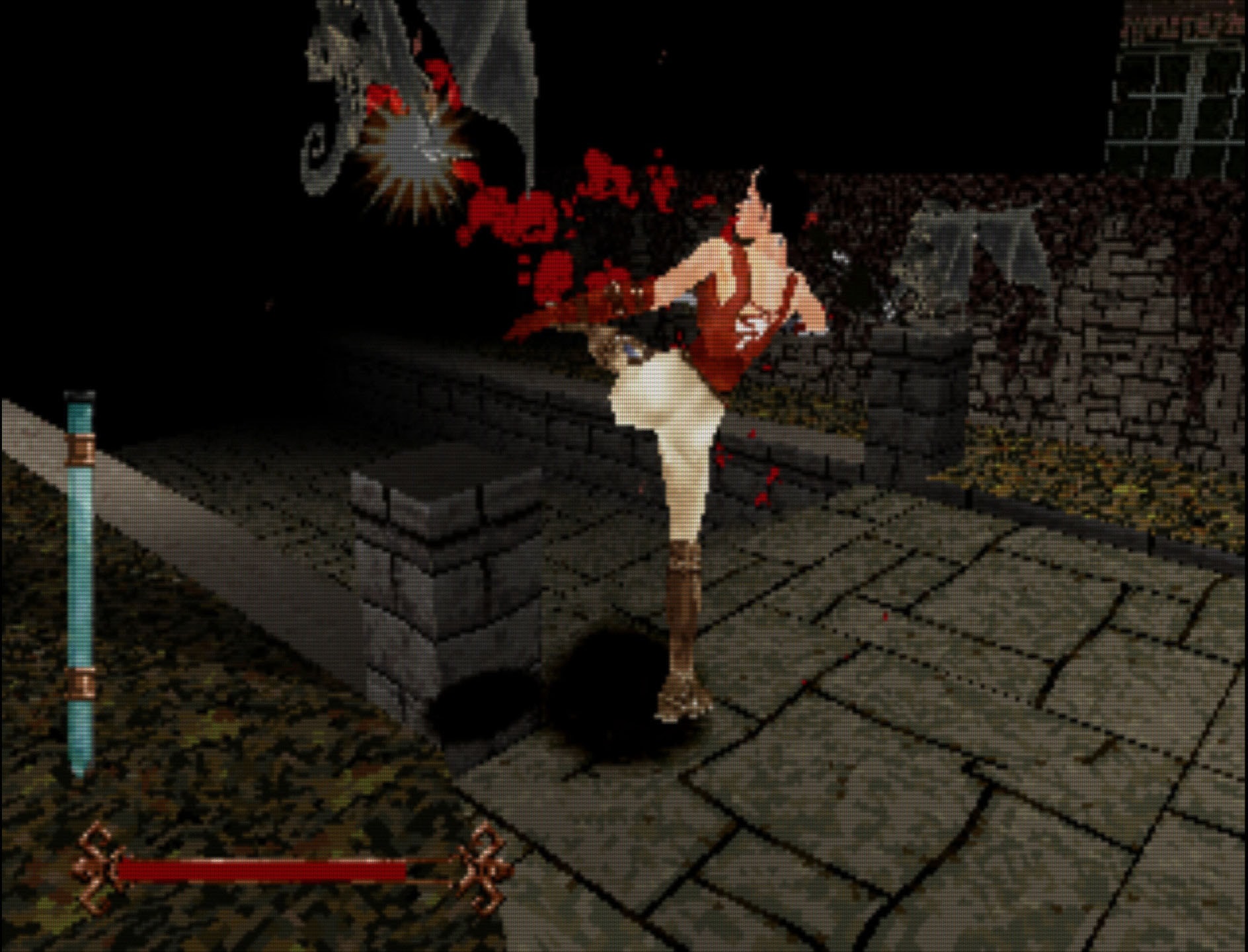 Kaikki Bloodbornea pelanneet pystyvät varmasti huomaamaan, että tämä ei todellakaan kuulosta tippaakaan FROMSoftin painokkaalta taistelusysteemiltä, ja kieltämättä tähän ne yhtäläisyydet sitten tyssäävätkin. Jos oikein siristää silmiään, voi nähdä inspiraatiota vaikka siinä, että myös Nightmare Creaturesissa pelaaja voi välillä räiskiä vihollisia pistoolilla. Tosin siinä missä Bloodbornessa pistooli on oleellinen osa pelisilmukkaa, nyt se on vain välillä löydettävä esine, joka ehkä tekee vihollisiin vähän enemmän vahinkoa kuin normaali isku. Sanon “ehkä”, koska joskus pistooli tuntui tappavan viholliset kerrasta, toisinaan sillä ei taas ollut oikein mitään vaikutusta.