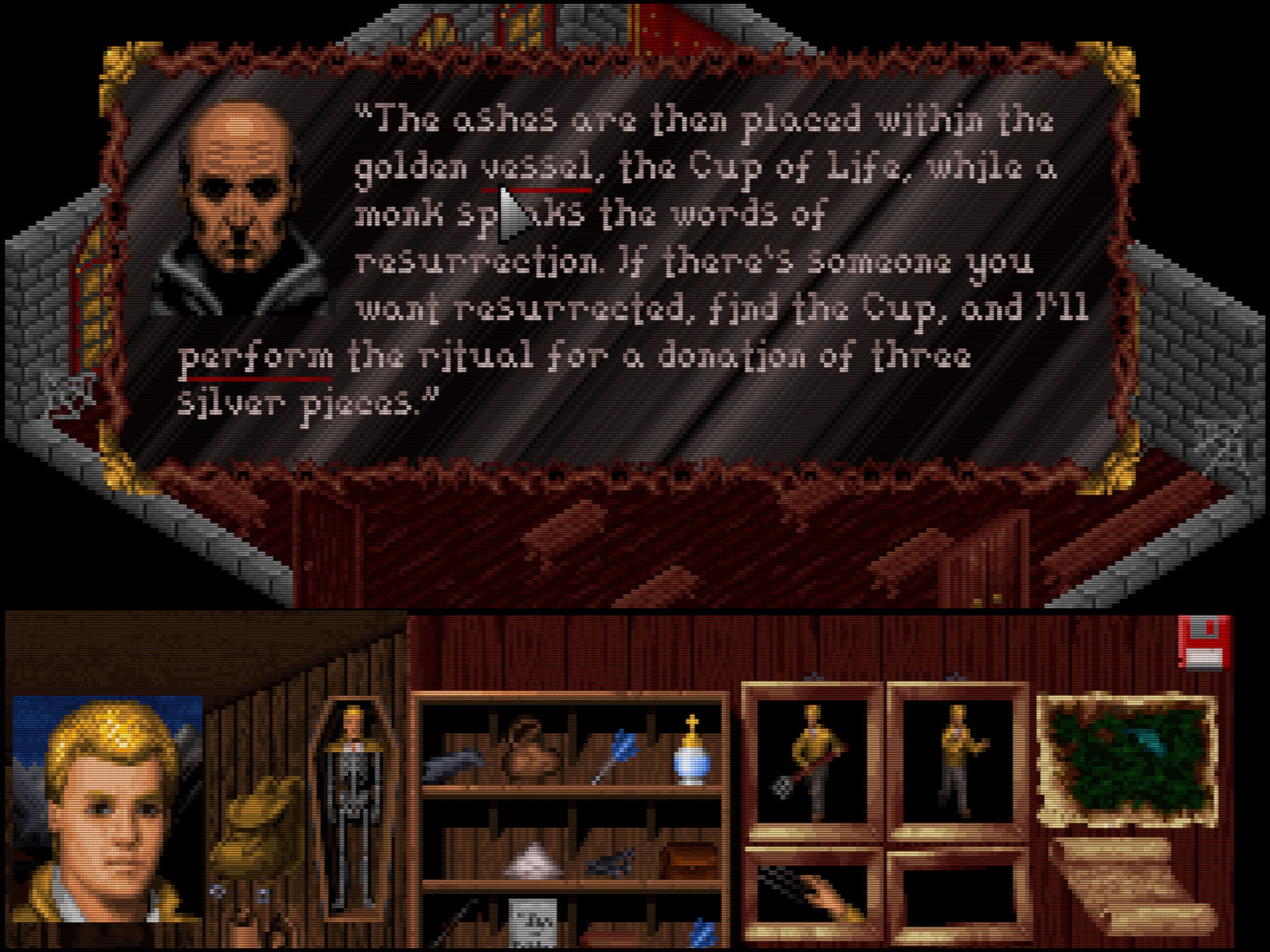 Sokkona ei toki tarvitse säheltää, sillä peli kyllä jakelee keskusteluissa hyvin vihjeitä. Paikallisen baarimikon hehkuttama kultainen malja toki tuntuu heti tärkeältä jutulta, joten kun syrjäisen luostarin hullu munkki myöhemmin mainitsee, että luostarin arvokas kalkki on kadonnut vuosia sitten mystisesti, on helppo tehdä johtopäätöksiä. Ainakin jos muistaa tehdä pelatessaan muistiinpanoja, sillä peli ei sitä todellakaan tee pelaajan puolesta.