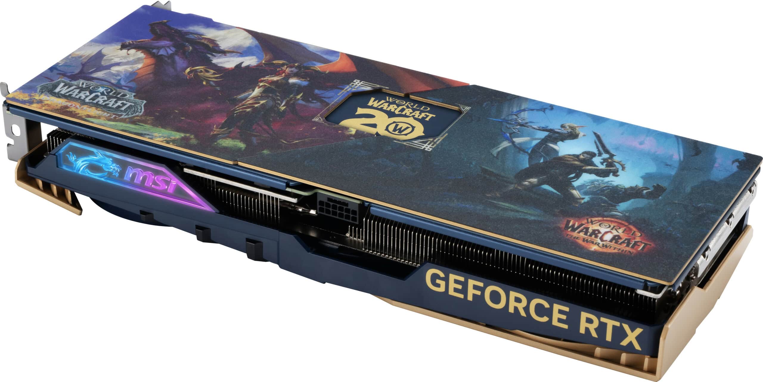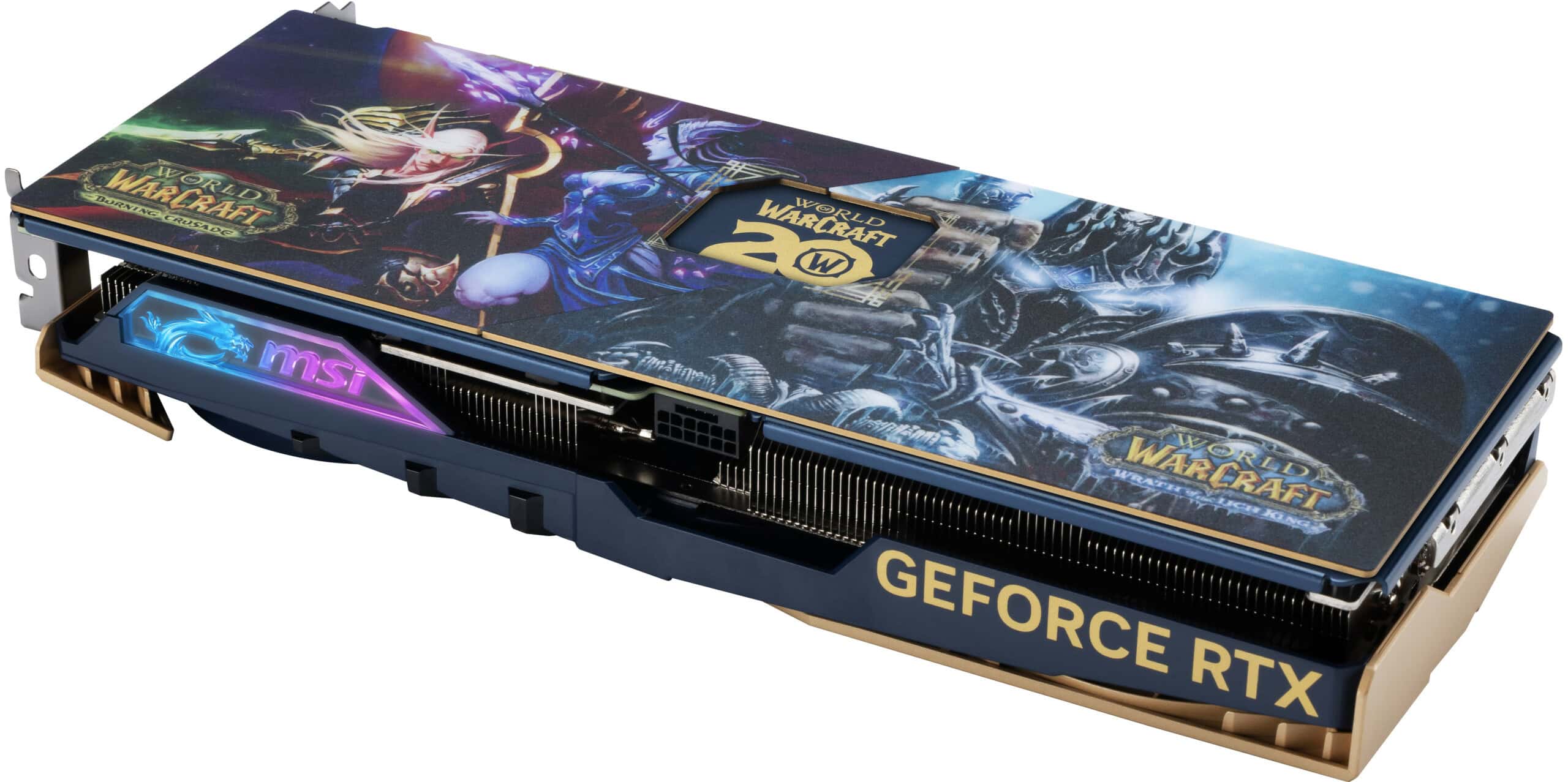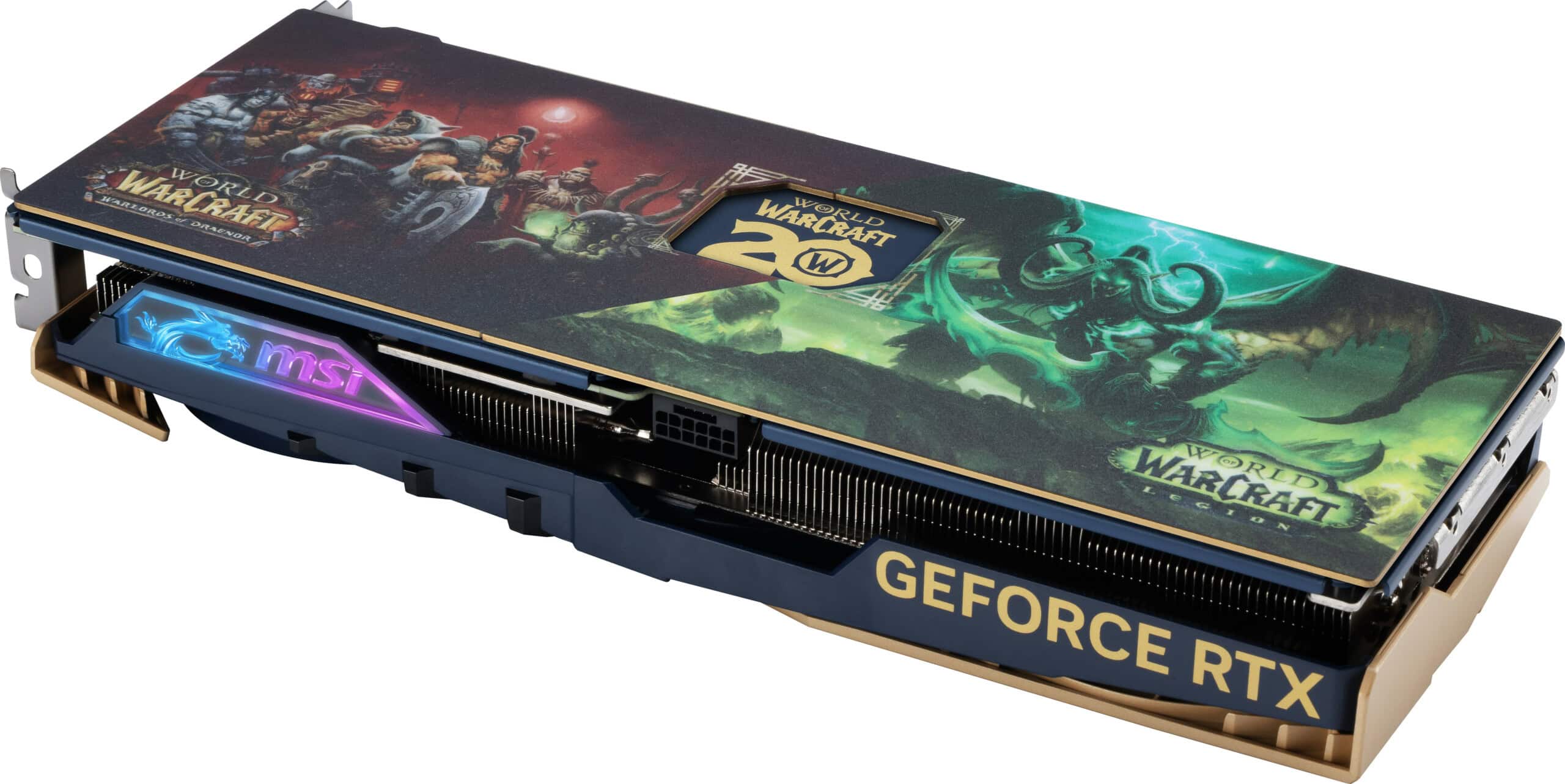 Upea näytönohjain on varusteltu kolmella MSI:n omaan teknologiaan pohjautuvalla huipputehokkaalla TORX 5.0 -tuulettimella ja rullaa hiljaisesti kovankin rasituksen aikana. Tuulettimet on väritetty teeman mukaisesti. Mittaa kortilla on 307 x 125 x 46 mm. Kortin mukana tulee niin ikään WoW 20v. -teemainen tuki, mikäli painovoima näyttää tekevän temppuja kortille kopassa.
