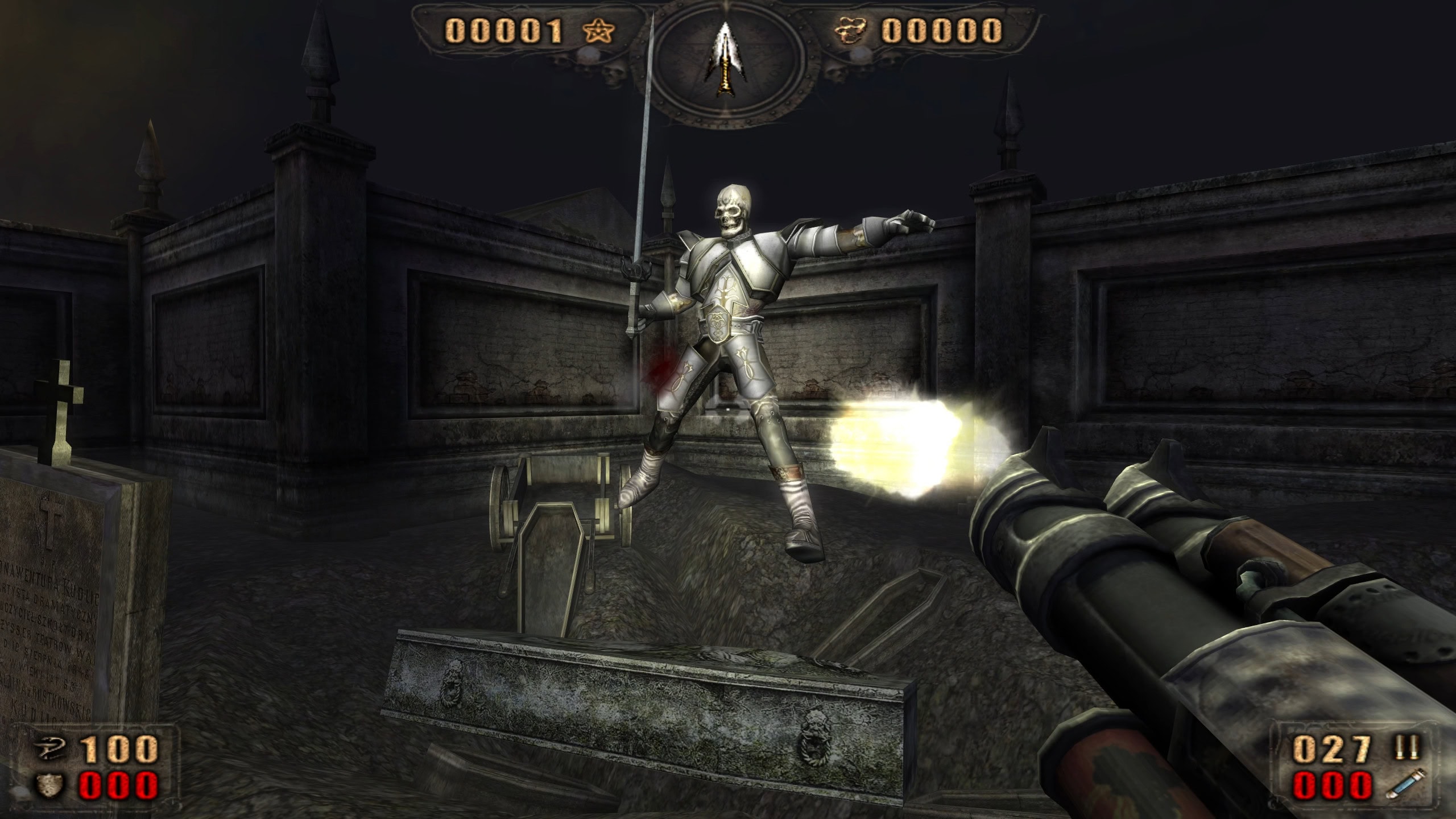 Kutsun taustatarinaa turhaksi kahdestakin syystä: ensinnäkin se on jäätävän kliseistä ja kehnosti kerrottua settiä, ja lisäksi täysin tarpeetonta. Painkiller ei kaipaa tarinaa tai suurta paatosta, koska homman suurin koukku on se itse pelattavuus. Ja tältä osin peli saakin sitten paremmat pisteet, koska se lataa korttinsa pöytään jo ensimmäisten sekuntiensa aikana. Pelaaja heitetään keskelle synkeää hautausmaata ja käteen lyödään kaksipiippuinen haulikko. Sitten haudoista hyppii esiin luurankoja, joita sitten tykitetään kikkelihevin tahtiin kumoon. Ei voisi olla paljon selkeämpää.