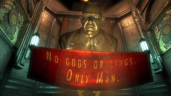 Bioshock ei häpeile poliittista sanomaansa, eikä pelkää ottaa kantaa, päinvastoin. Se lataa korttinsa pöytään jo elokuvamaisessa introssaan, jossa pelaajan ohjastama nimetön tyyppi istuu sikari ja viskilasi kädessään lentokoneessa jossain Atlantin yläpuolella. Lentokone putoaa ja sen ainoa selviytyjä löytää itsensä merestä törröttävän majakan lähettyviltä. Majakan sisältä taas paljastuu mystinen kultainen patsas ja sitä koristava “ei jumalia tai kuninkaita. Ainoastaan ihminen”-banderolli, sekä syvyyksiin vievä hissi.