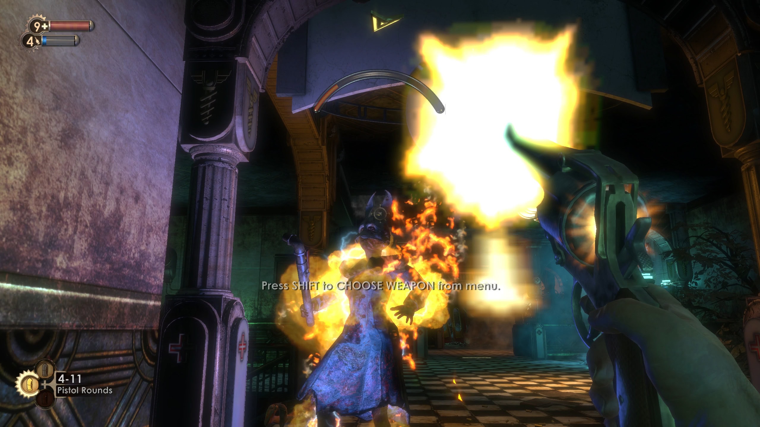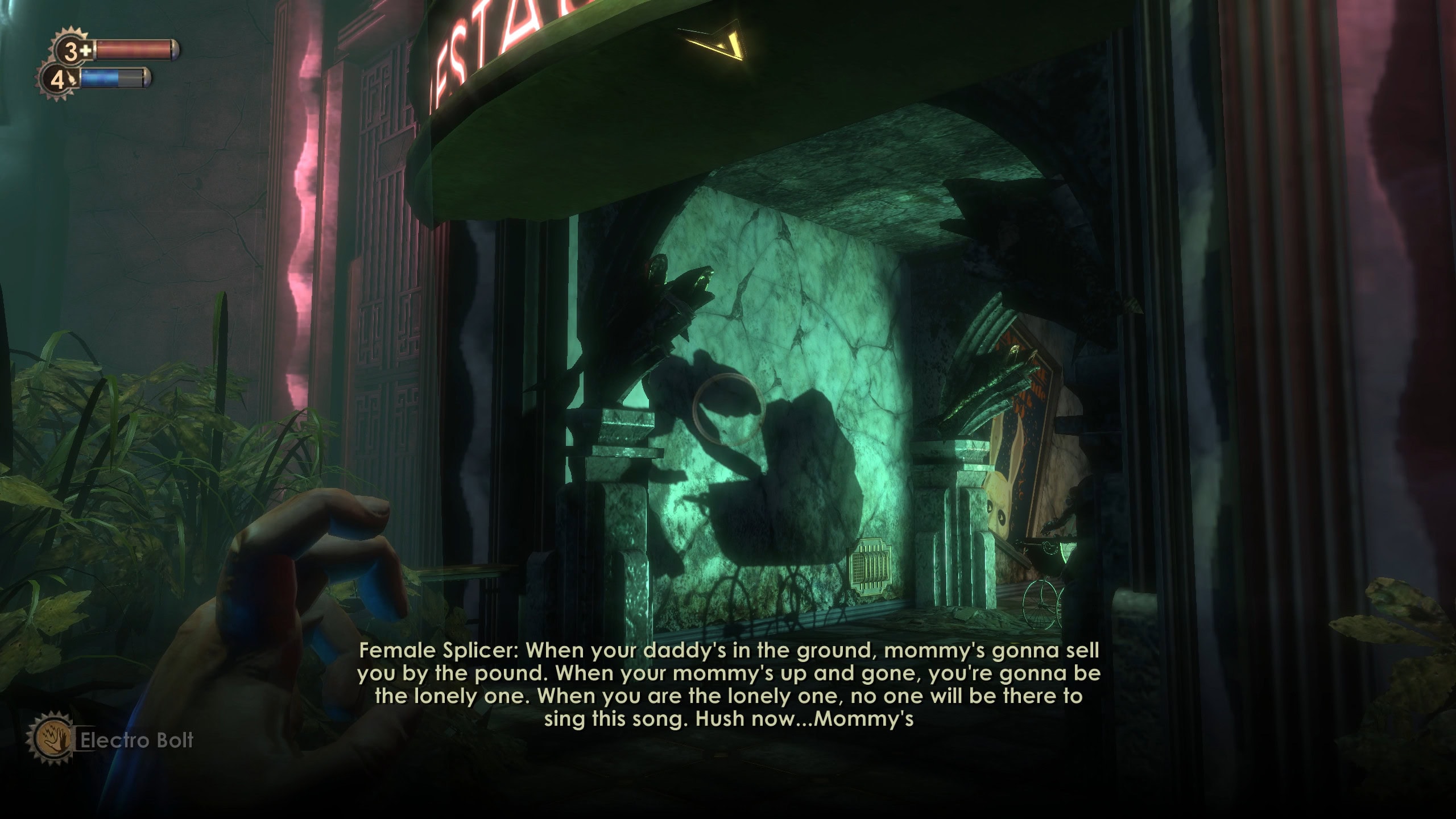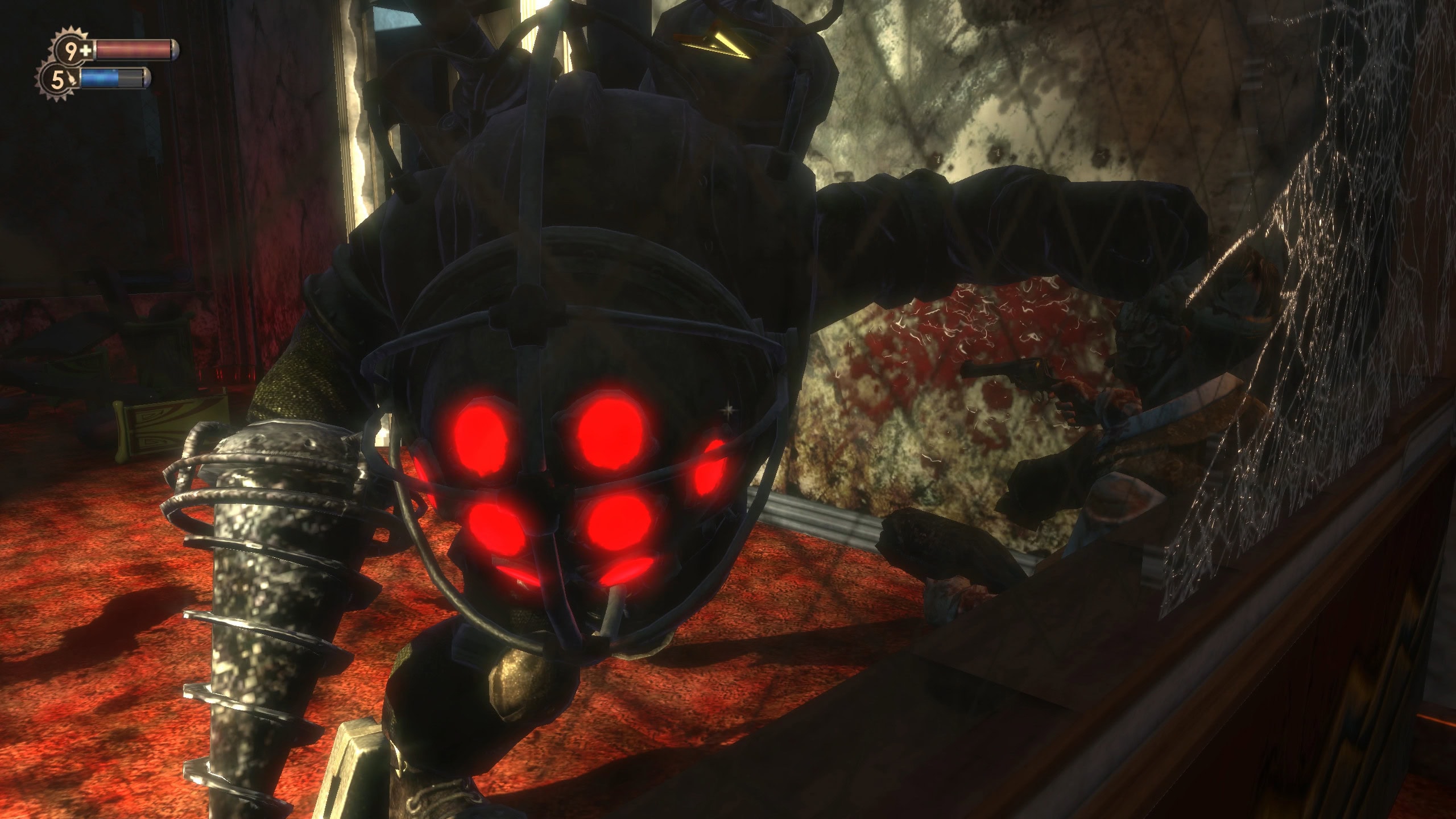 Joten mikä sitten meni mönkään? Miksi mainitsin jo varhain, että Bioshock ei ole lähellekään täydellinen peli. Ne perinteiset jutut, tietenkin. Tiimillä riitti kunnianhimoa ja korkealentoisia ideoita, mutta ei aina mahdollisuuksia tai kykyjä toteuttaa niitä kaikkia täysin. Esimerkiksi ne juuri mainitut pikkusiskot ja Big Daddyt olivat kyllä iskeviä hahmoja, mutta niiden ympärille rakennettu moraalisysteemi ei sitten toiminutkaan aivan yhtä hyvin. Pelaaja joutuu pelin aikana taistelemaan Big Daddyja vastaan useasti ja jokaisen taistelun jälkeen päättämään, haluaako imeä tämän suojelemasta pikkusiskosta itselleen ylimääräisiä voimia — ja täten tappaa tämän — vai pelastaa pikkusiskon. Tämä olisi voinut olla hyvän ja toimivan systeemin alkupiste, mutta Bioshockissa se on koko systeemi. Haluatko olla sarjakuvamaisen läpimätä paskiainen, joka tappaa pikkutyttöjä, vai et?