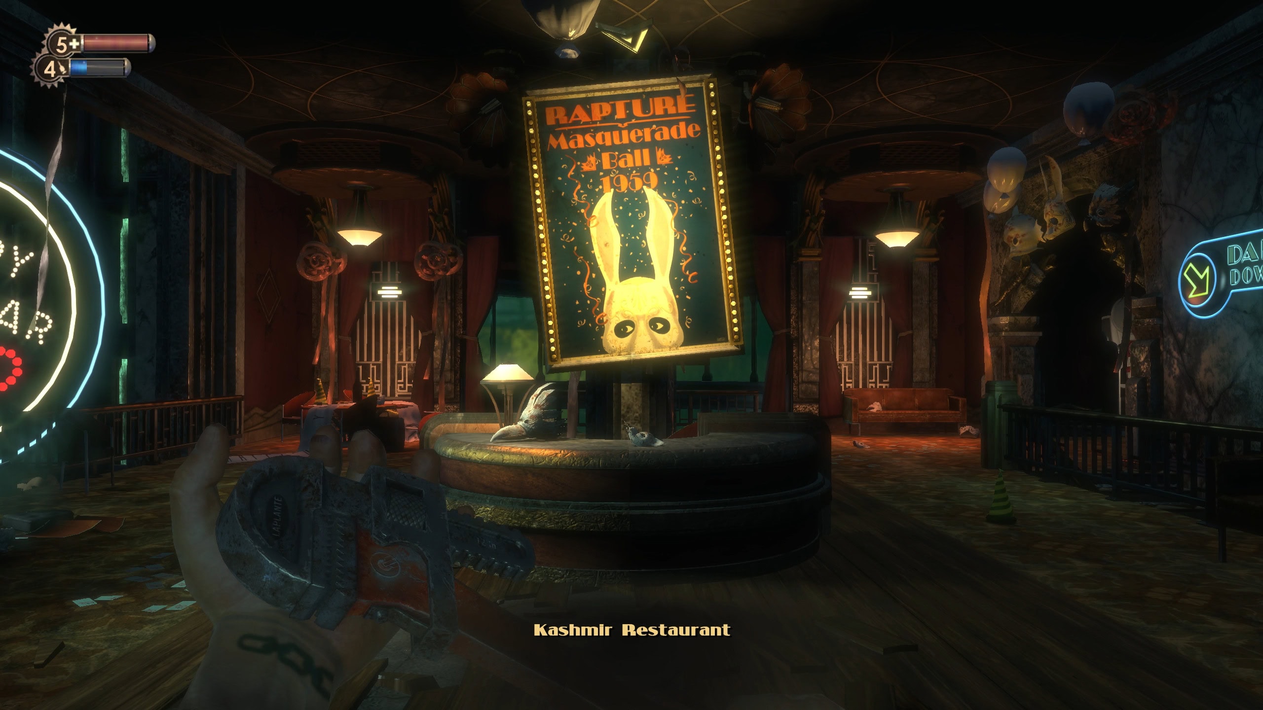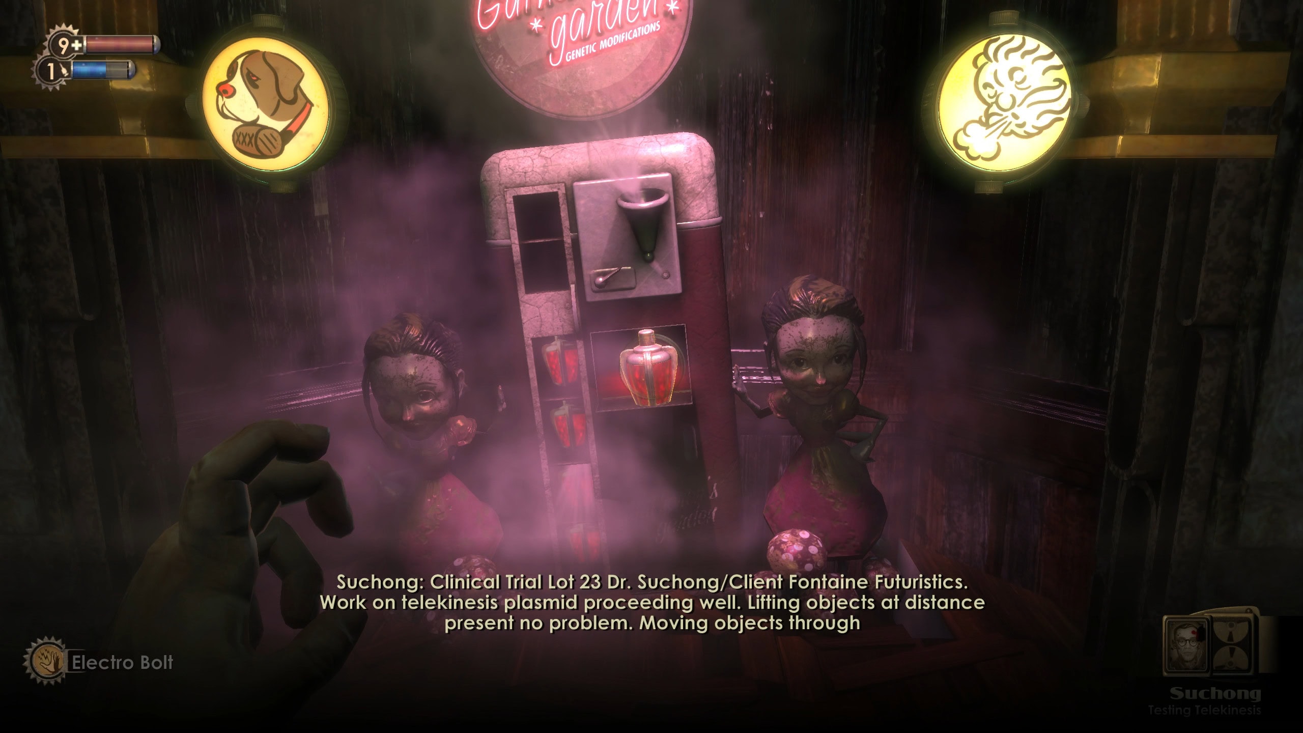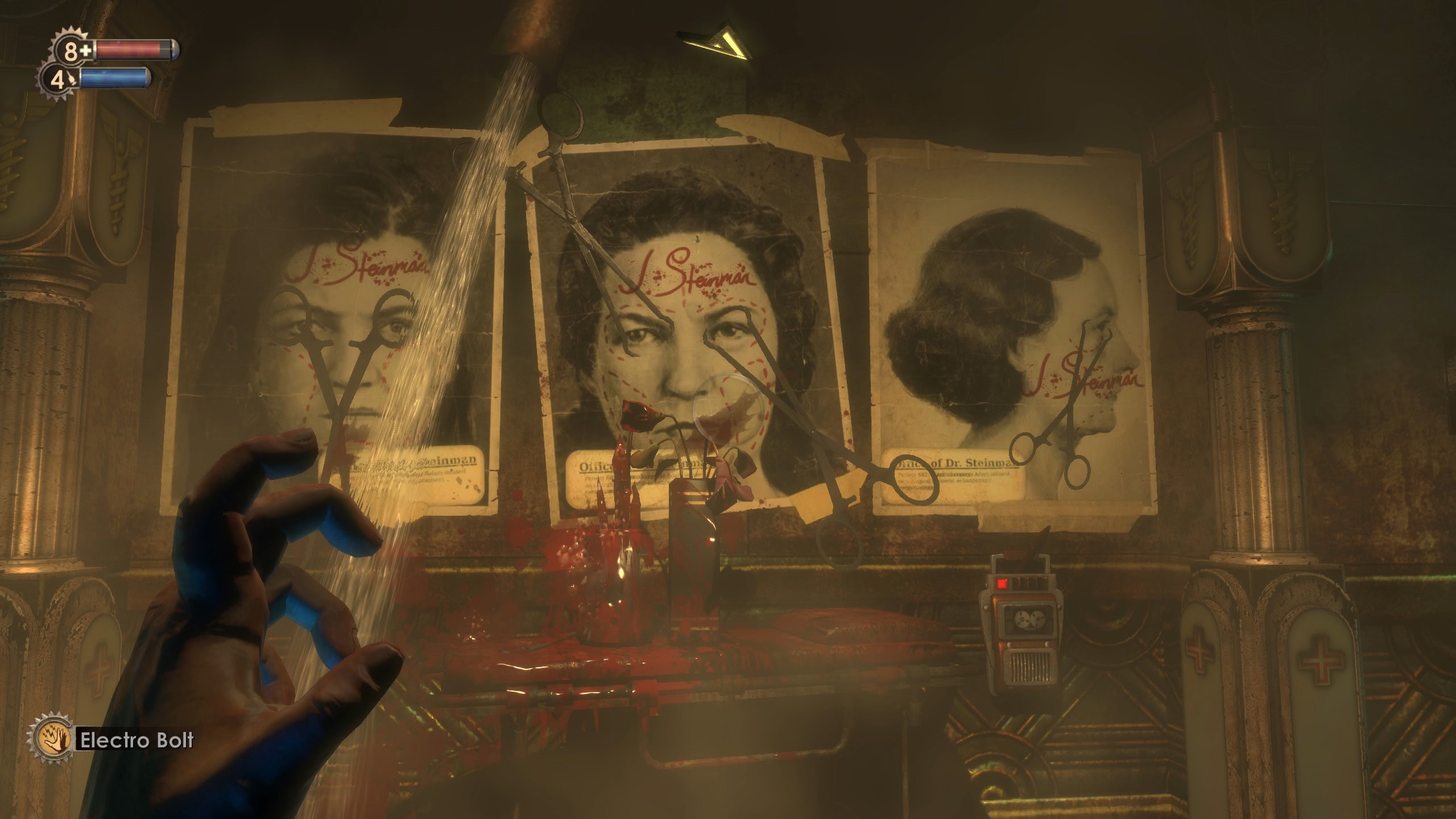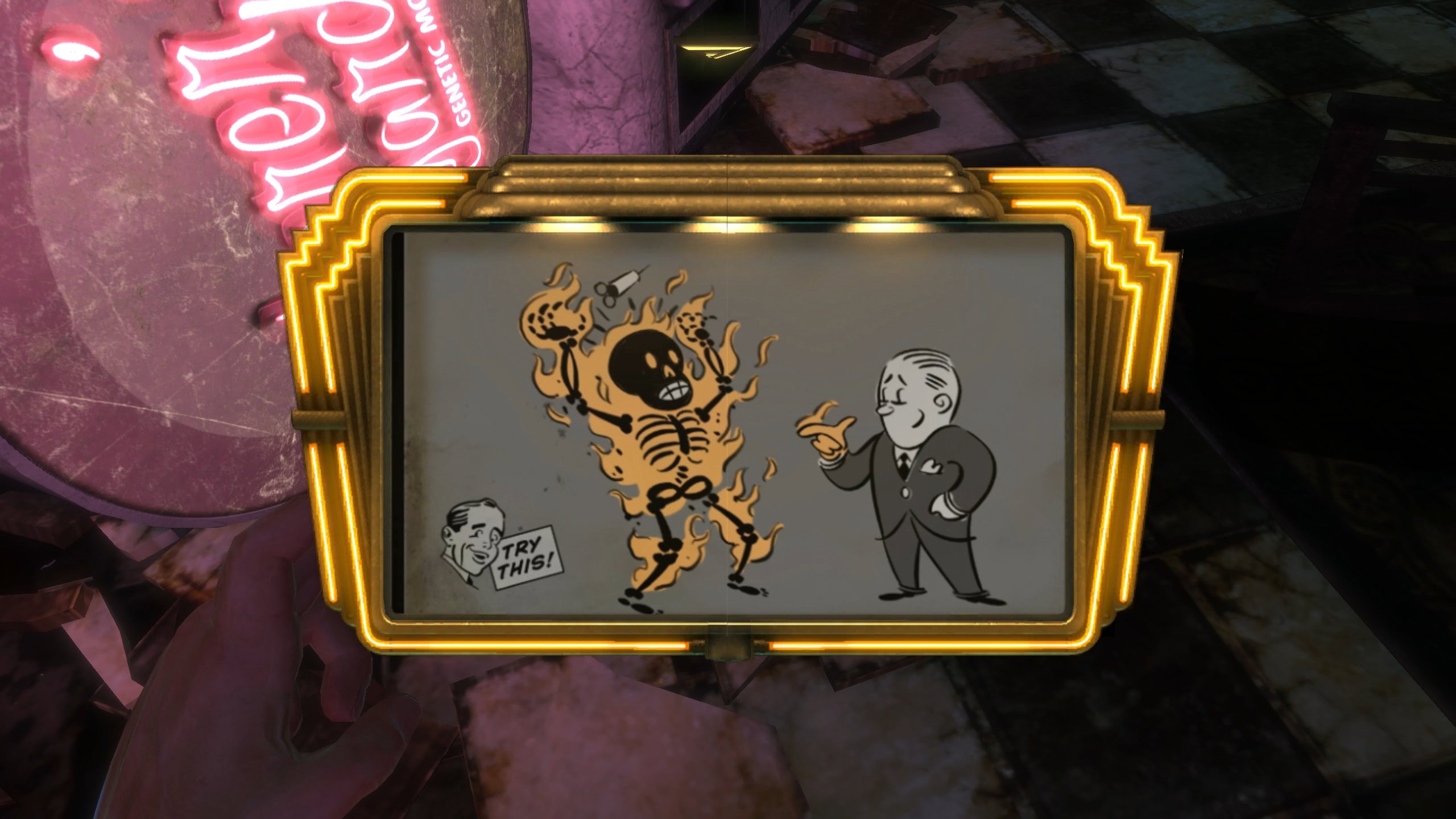 Joten mikä sitten meni mönkään? Miksi mainitsin jo varhain, että Bioshock ei ole lähellekään täydellinen peli. Ne perinteiset jutut, tietenkin. Tiimillä riitti kunnianhimoa ja korkealentoisia ideoita, mutta ei aina mahdollisuuksia tai kykyjä toteuttaa niitä kaikkia täysin. Esimerkiksi ne juuri mainitut pikkusiskot ja Big Daddyt olivat kyllä iskeviä hahmoja, mutta niiden ympärille rakennettu moraalisysteemi ei sitten toiminutkaan aivan yhtä hyvin. Pelaaja joutuu pelin aikana taistelemaan Big Daddyja vastaan useasti ja jokaisen taistelun jälkeen päättämään, haluaako imeä tämän suojelemasta pikkusiskosta itselleen ylimääräisiä voimia — ja täten tappaa tämän — vai pelastaa pikkusiskon. Tämä olisi voinut olla hyvän ja toimivan systeemin alkupiste, mutta Bioshockissa se on koko systeemi. Haluatko olla sarjakuvamaisen läpimätä paskiainen, joka tappaa pikkutyttöjä, vai et?