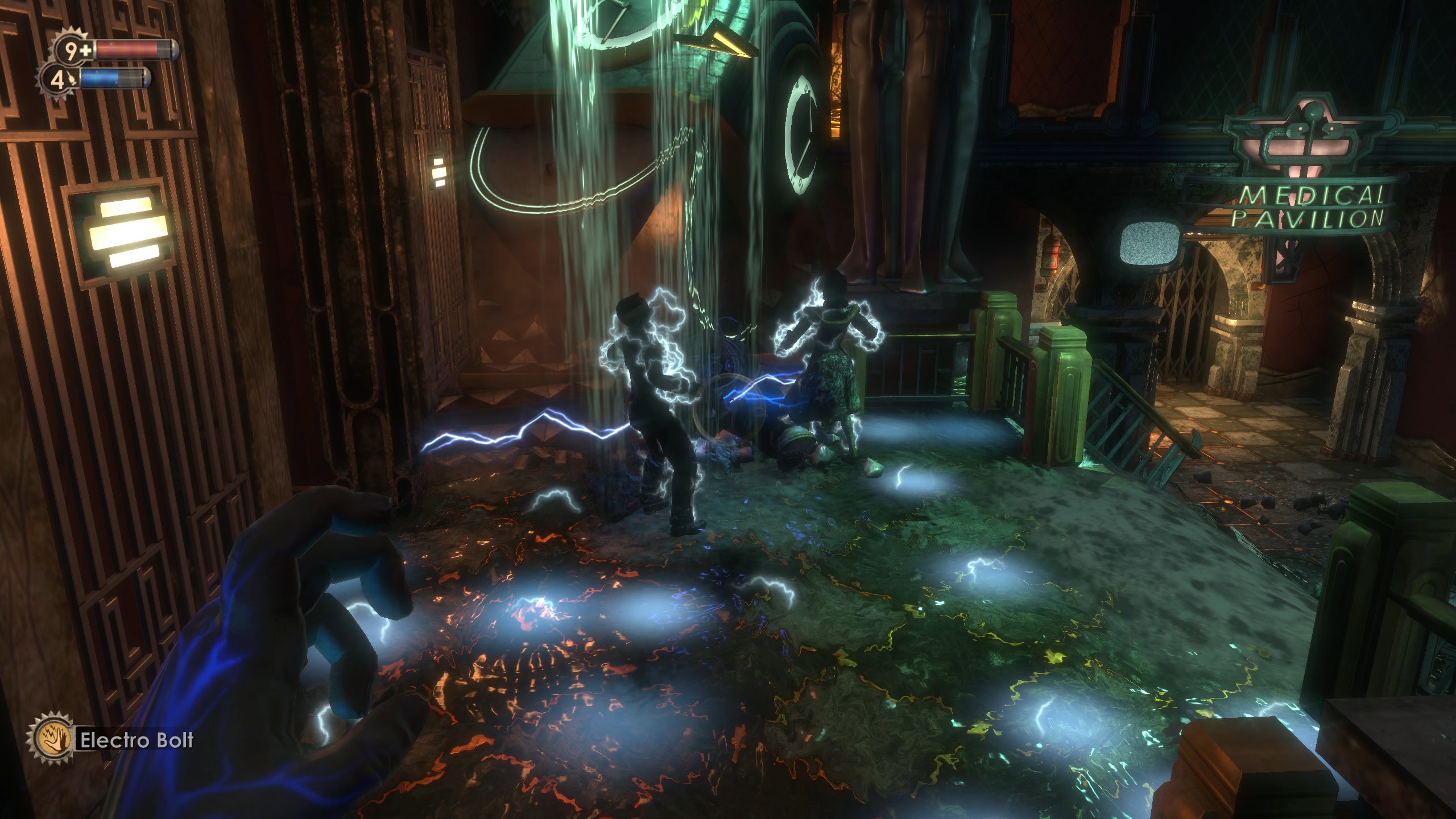 Bioshock muistetaan positiivisesti myös toiminnastaan. Kyseessä on hyvin ammuskelupainoitteinen peli, jossa pelaaja saa jatkuvasti taistella kaupungin raunioissa vaanivia huumehörhöjä ja muita vaaroja vastaan. Perustason pyssyjen ohella käytössä on alati kasvava valikoima “plasmideja”, geneettisiä muokkauspaketteja, jotka antavat käyttäjälleen yliluonnollisia voimia. Niiden avulla pelaaja oppii vaikka ampumaan kädestään salamoita tai sytyttämään esineitä tuleen ajatuksen voimalla. Näiden yliluonnollisten kykyjen hyödyntäminen ja yhdistely on merkittävä osa Bioshockin immersiivisestä sisällöstä. Jos löytää vaikka pinon pahiksia seisomassa vesilätäkössä, veden sähköttäminen antaa kerralla koko porukalle arvokkaan läksyn. Ja toki jos vastassa on sähkökyvyillä varustettuja vihollisia, kannattaa ehkä itse pysyä pois vedestä.