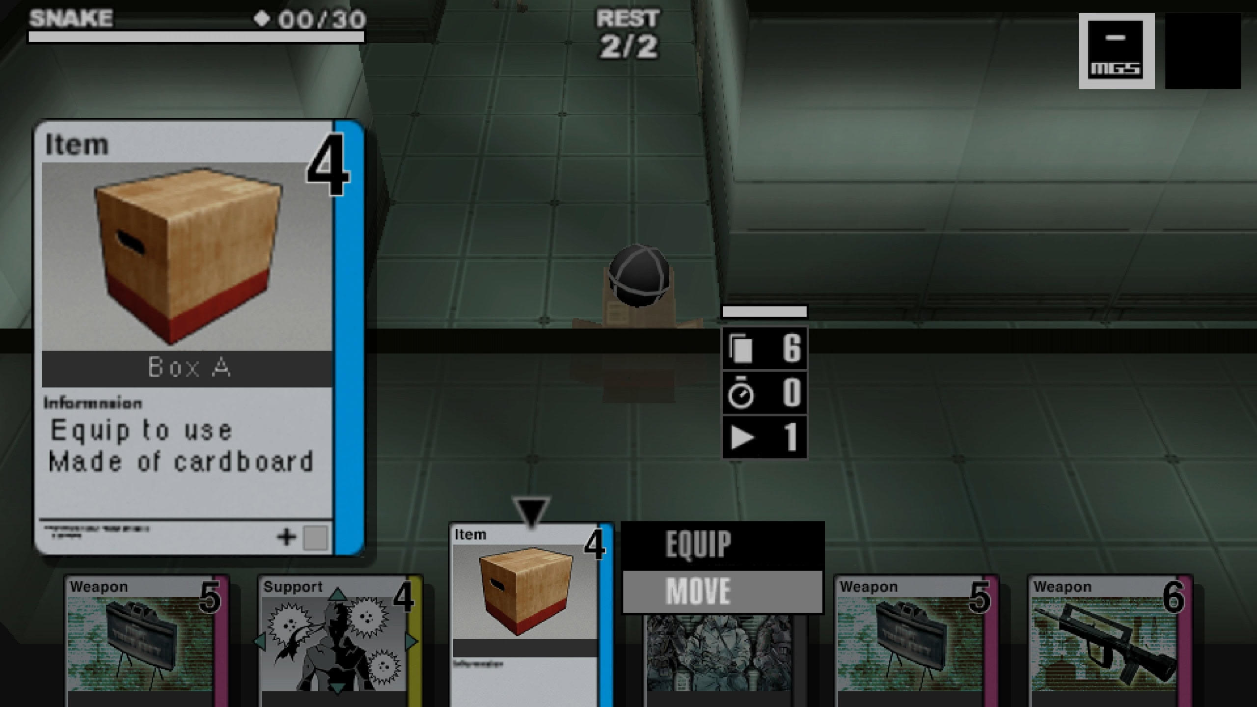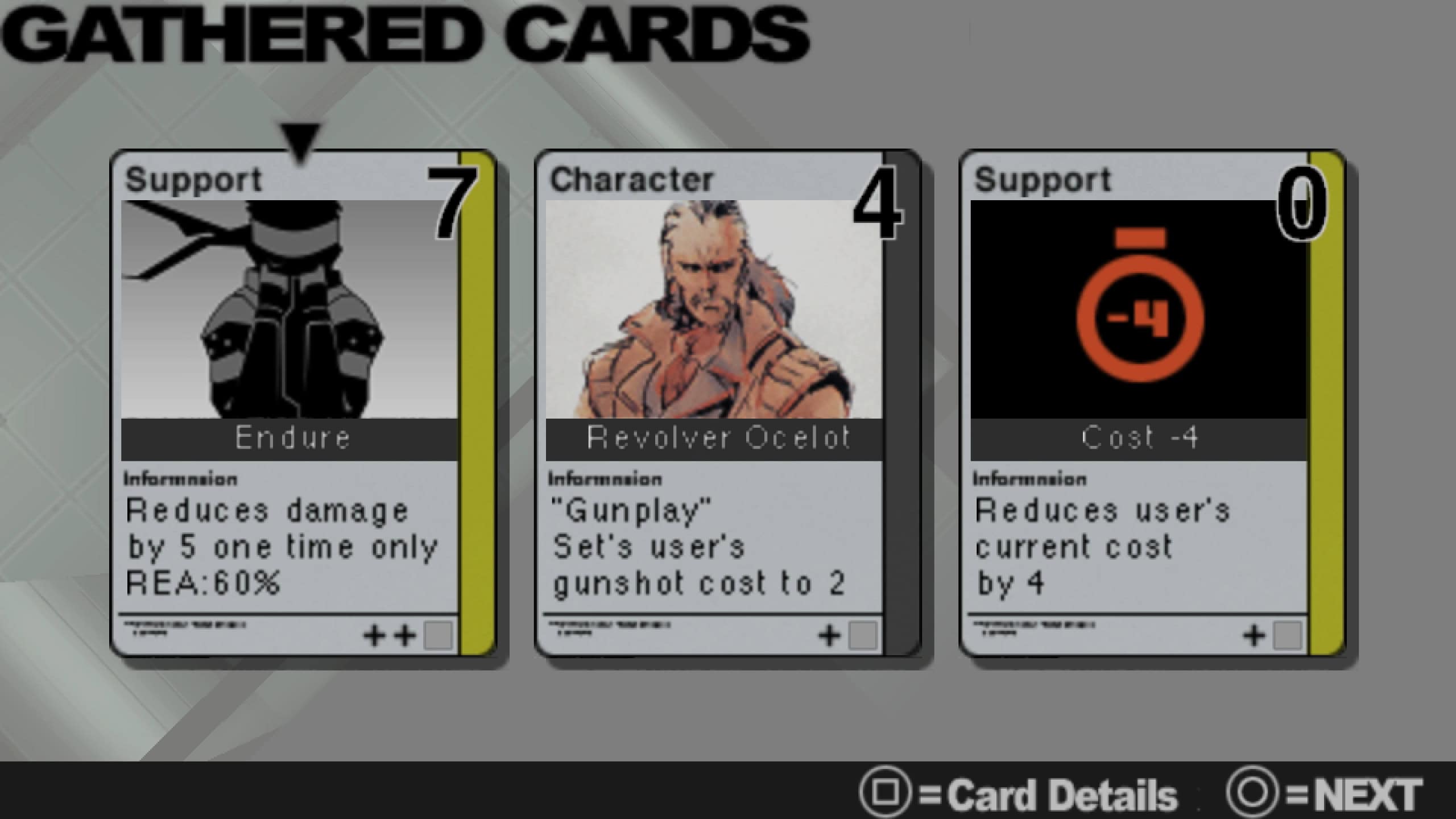 Pelaaja saa kuhunkin tehtävään mukaan vähintään 30 kortin muodostaman pakan, jonka jokainen kortti edustaa Metal Gear -peleistä tuttuja hahmoja tai esineitä, ja joilla kaikilla on omat toiminnallisuutensa. SOCOM-kortin pelaamalla voi ampua vihollista pistoolillaan, Vulcan Raven -kortilla taas laskea ammuskelukorttien hintaa muutamaksi vuoroksi, pahvilaatikko-kortilla piiloutua pahvilaatikon alle ja niin edelleen. Uusia kortteja kerätään tehtävistä tai ostellaan pelin sisäisellä valuutalla korttikaupasta, mutta kyse ei tietenkään ole mistään oikeasta keräilykorttipelistä, jossa täytyisi polttaa oikeaa rahaa folioidun Meryl-kortin jahtaamiseksi.