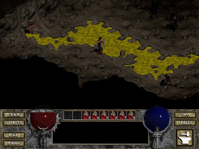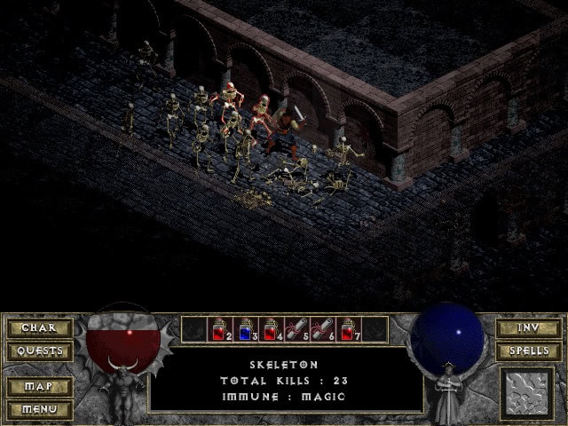Itse pelasin Diabloa aikanaan ensiksi soturilla, kuten minulla oli jo Dungeons & Dragons -pöytäpeleistä saakka ollut tapana. Luolaston alkumetreillä vastaan tuli suuri huone, joka tuntui sisältävän loputtomat määrät punaista: irtoraajoja, suolia, verta, torsoja. Läheisen Tristramin kaupungin kadonneiden asukkaiden kohtalo oli selvinnyt, eikä syyllistäkään tarvinnut kovin kauan ihmetellä, sillä kun vielä kauhistelin minua ympäröiviä karmeita näkyjä, ruudulle paukahti legendaarinen huudahdus: ”Ahh, fresh meat!”