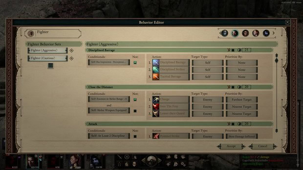 Ykkös-Pillarsissa hahmoille voi valita taistelun avuksi eri tekoälypaketteja, kuten ”puolustava taistelija” tai ”aggressiivinen velho”, jotka vähensivät mikromanagerointia entisestään. Deadfiressa näitä paketteja voi säätää vapaasti, ja niitä voi tehdä jopa itse. Voit siis räätälöidä ryhmäsi kaikkien hahmojen tekoälyt vapaasti juuri niihin kykyihin, joita satut heille valitsemaan. Järjestelmä on tuttu muun muassa Final Fantasy XII:n gambitit nähneille.
