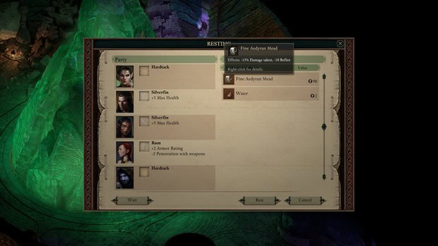 Haavoja voi poistaa lepäämällä, ja myös tämä järjestelmä on uusittu. Ykkösessä kulutettiin abstrakteja ”leiriytymisvarusteita”, joita ryhmällä saattoi olla mukana enimmillään neljä. Nyt joka hahmolle valitaan eväät suuresta valikoimasta. Köyhin sapuska eli laivakeksit parantavat haavat pois, mutta kaikki sitä parempi antaa erilaisia bonuksia taistelussa. Tekijöiden mukaan ideana on se, ettei laivakeksien ole tarkoitus loppua, paitsi jos pelaaja mokaa todella pahasti. Sen sijaan pahojen taistelujen vaikeutta vähennetään oletusarvoisesti vetämällä naamariin tarkkaan valittua apetta, jota voi kokata pelin crafting-järjestelmällä. Kukapa nyt haluaisi tapella, jos sitä ennen ei ole tullut nautittua laatuviiniä ja gourmet-särvintä?