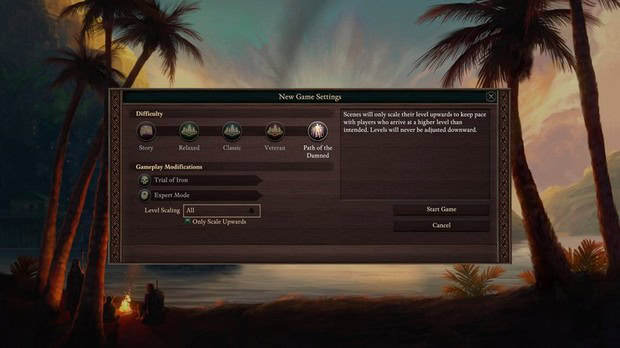 Ennen kuin taisteluun edes pääsee, pitäisi kuitenkin päättää, millaiseen lihamyllyyn hahmonsa lähettää. Deadfiressa on viisi eri vaikeustasoa. Classic on Baldur’s Gatensa pelanneille ja Veteran sekä karmea Path of the Damned mestareina itseään pitäville. Relaxed ja Story ovat niille, jotka haluavat ennemmin keskittyä dialogeihin ja rentoon seikkailuun. Lisäksi voi aktivoida Trial of Iron -tilan, joka tuhoaa tallennuksen kuolon tullessa. Vihollisten tasoskaalautumista ei ole perustilassa, mutta senkin voi aktivoida. Viholliset voi säätää mukautumaan ryhmän tasoon joko koko pelissä tai pelkästään juonen kannalta kriittisillä alueilla. Skaalautumisen voi myös säätää nostamaan tasoa pelkästään ylöspäin, jolloin haaste pysyy aina tasaisen tappavana.