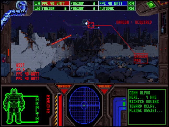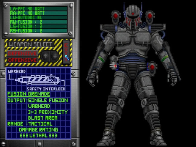 Osa näistä lennokkaista ideoista on turhankin lennokkaita. Yksi alusta saakka käytössä oleva ase on raskas kranaatinheitin, jolle olisi myös käyttöä, jos sen käyttäminen ei olisi käytännössä itsemurha. Pelaajan kun täytyy seistä paikallaan, viedä hiiren kursori kohteen päälle ja sitten ladata hiiren nappia pohjassa pitämällä kranaattin virtaa. Paljonko virtaa? No, kranaatin tähtäin liikkuu eteenpäin tutkaruudulla, joten sen perusteella pitäisi arvioida, milloin se risteää kohteen kanssa. Sitten odotetaan kranaatin lentoa. Hups, se meni ohi. No, sitten yritetään uudellee… ah, viholliset tappoivat minut jo.