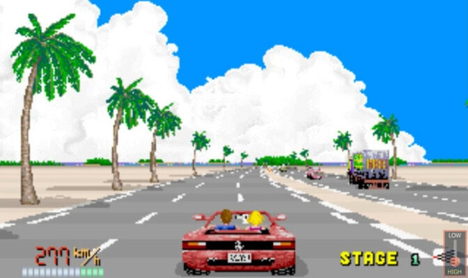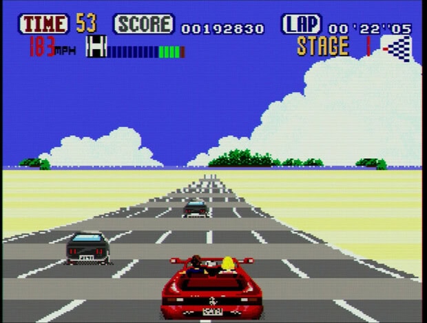 Vuonna 1986 julkaistu Outrun ei ole Segan ensimmäinen kolikkopeli, ensimmäinen huristelupeli eikä edes ensimmäinen sinisiä taivaita pursuava peli. Mutta se on se legendaarisin. Outrunissa yhdistyivät kaikki erinomaisen kolikkopelihitin ainekset. Se oli kämäisten kotitietokoneiden aikana todella näyttävä peli. Vauhdin tuntu oli hillitön, soundtrack erinomainen ja pelattavuus niin koukuttavaa, että kun matka väistämättä päätyi voltteja lentävän Ferrarin myötä, automaattiin oli pakko syöttää lisää rahaa.