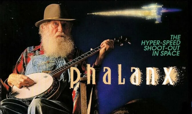 Ratkaisu oli kieltämättä aika ikimuistoinen: Guss ja Campbell löivät pelin kanteen banjoa soittavan vanhan ukkelin, jonka taustalla lentää pikkuruinen pelin avaruusalus. Ei, banjoa soittavalla äijällä ei ole mitään tekemistä pelin kanssa, mutta se on koko jutun pointti: Phalanx erottuu heti kilpailijoistaan. Katsoja huomaa varmasti banjoukkelin ja pysähtyy ihmettelemään itsekin samaa kysymystä. Miksi? Miten? Mikä hiton peli tämä oikein on?