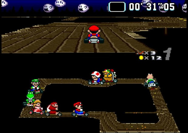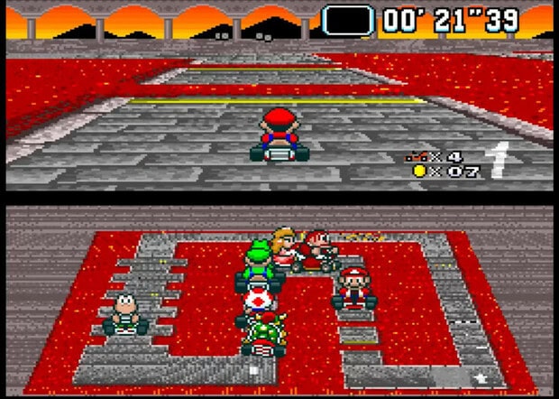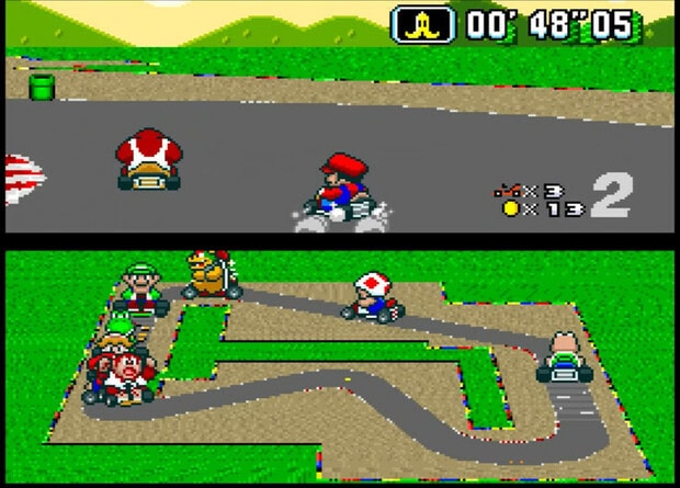 Niin hämmentävää kuin se onkin, Super Mario Kart ei todellakaan sisällä minkäänlaista koko ruudun pelitilaa, vaan yksinpelissäkin puolet ruudusta on omistettu kohtalaisen hyödyttömälle kartalle. Toisaalta ominaisuutta käytetään hauskasti hyödyksi myös esimerkiksi näyttämällä, miten viholliset heittelevät banaaninkuoria pelaajan tielle.