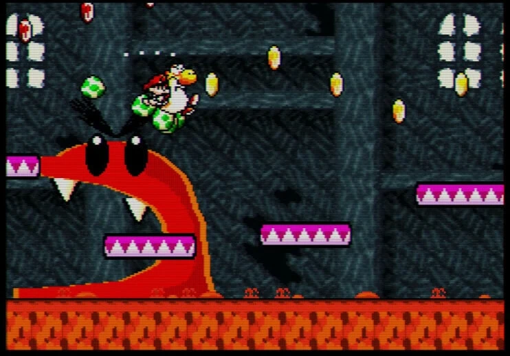 Se suurin syy minun Yoshi’s Island -fanitukseeni on kuitenkin se, että peli uskaltaa olla erilainen, outo ja yllättävä. Jo aivan pelin alkuvaiheilla vastaan tulee legendaarinen kenttä: Touch Fuzzy, Get Dizzy. Normaalin tasohyppelyalun jälkeen vastaan leijailee valtavia pölyhaituvan näköisiä Fuzzyjä, joihin koskeminen… no, sekoittaa yoshien pään. Koko maailma alkaa aaltoilla musiikin venyessä maisemien tahtiin ja yoshin hoiperellessa ympäriinsä kuin kaatokännissä konsanaan.