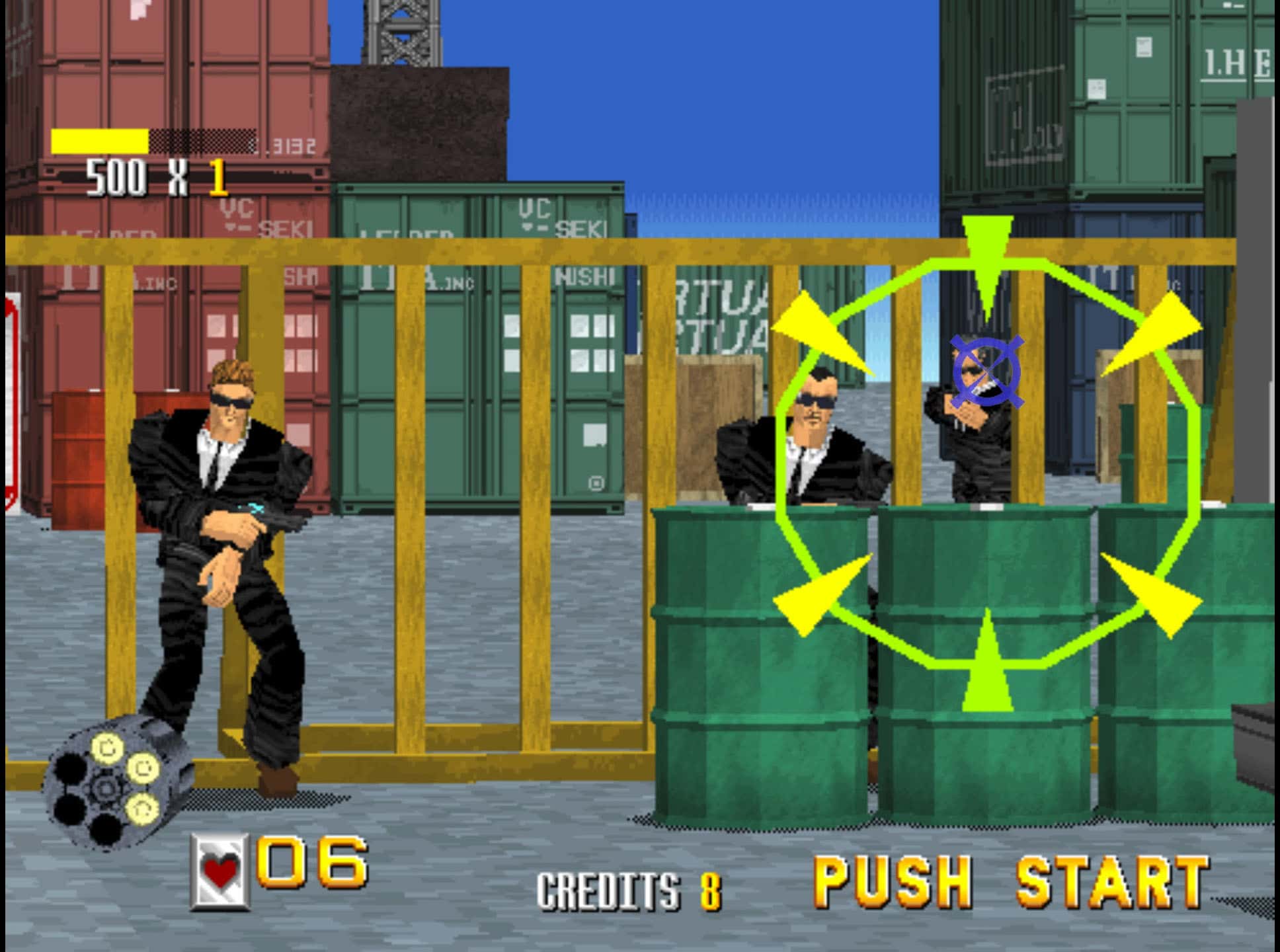 Sega itse hehkutti aikanaan, että kyseessä oli ”maailman ensimmäinen polygoneilla ja tekstuureilla toteutettu toimintapeli”, mikä ei kuulosta vuoden 1994 pelijulkaisun osalta oikealta, mutta toisaalta en keksi lonkalta vastaväitteitäkään. Quake oli vielä parin vuoden päässä, Doom ja esimerkiksi Ultima Underworldit käyttivät 2D-pelihahmoja ja niin edelleen. Oli miten oli, Virtua Cop oli täyttä 3D:tä.
