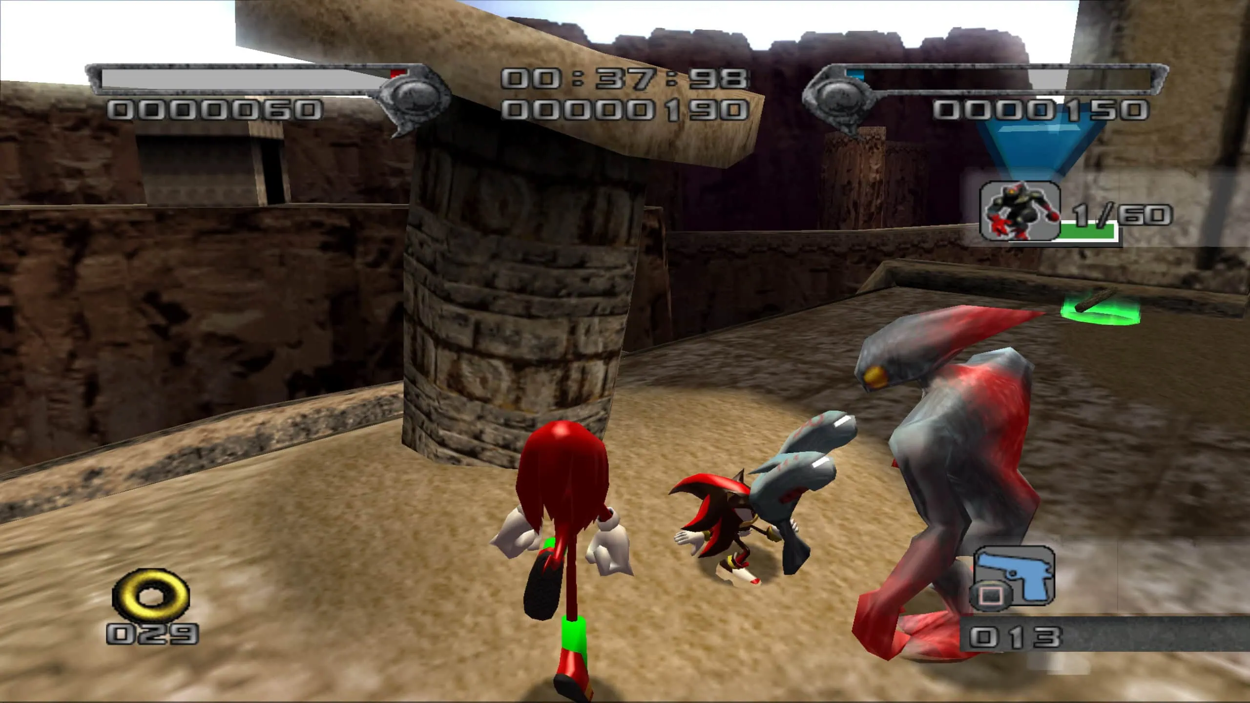Hämmennyksen taso ei laske, kun siirrytään myötähäpeää aiheuttavista välianimaatioista itse pelin pariin. Shadow the Hedgehog tuo mieleen Sonic Adventure -pelit, mutta vielä kehnommin tehtynä. Mukana on osioita, joissa Shadow juoksee nopeasti ränneissä keräten renkaita ja väistellen milloin mitäkin esteitä. Okei, olemme toistaiseksi kohtalaisen vankalla maaperällä, mitä nyt ainakin PlayStation 2 -version ruudunpäivitysnopeus takkuilee välillä niin paljon, että pelaaminen on hankalaa, mutta silti: Sonic-menoa.