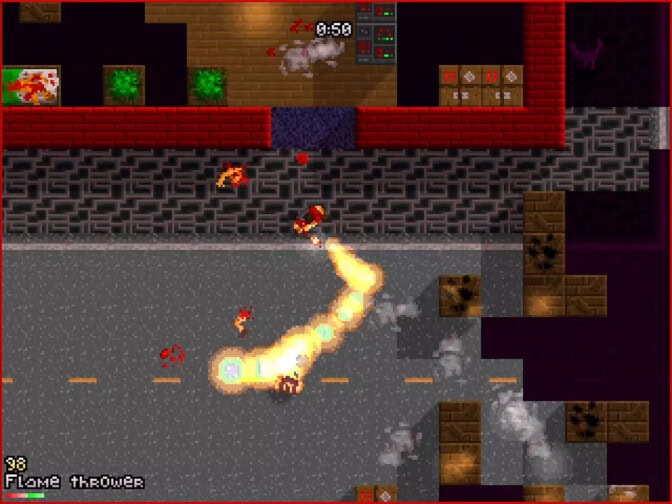 Silti, haluan nostaa kehitystiimille hattua muutamastakin jutusta. Ensinnäkin peli on teknisesti aika vaikuttava teos. Pikseligrafiikka on yksinkertaista, mutta persoonallista. Veriefektit ovat hyvin runsaat ja myös erilaisten aseiden räjähdykset ja liekkiefektit ovat oikein näyttäviä. Lisäksi, jopa suorastaan hämmentävästi, kun kyseessä kuitenkin on parin kaverin tekemä peli, Ultimate Tapan Kaikki sisältää tuen verkkomoninpelille, mikä on oikeasti vaikuttava saavutus. 90-luvulla tällainen piti kaikki tehdä itse alusta saakka, eivätkä rajapinnat olleet läheskään niin kehittyneitä tai helppokäyttöisiä kuin nykyään.