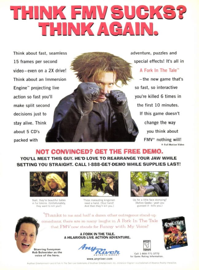 Ei siitä mihinkään pääse, A Fork in the Tale on surkea peli. Tämä ei toki ole mitenkään yllättävää: se on 90-luvulla tehty FMV-peli, ne olivat kaikki surkeita pelejä! Useimmat niistä ovat surkeita tylsällä tavalla. Ne näyttävät karuilta, niiden pelaaminen on tympeää, eikä niissä ole mitään muuta kiinnostavaa kuin sen pohtiminen, että jotkut urpot ihan oikeasti ja vakavissaan kuvittelivat, että ne olivat paitsi pelien, myös kaiken visuaalisen median tulevaisuus.