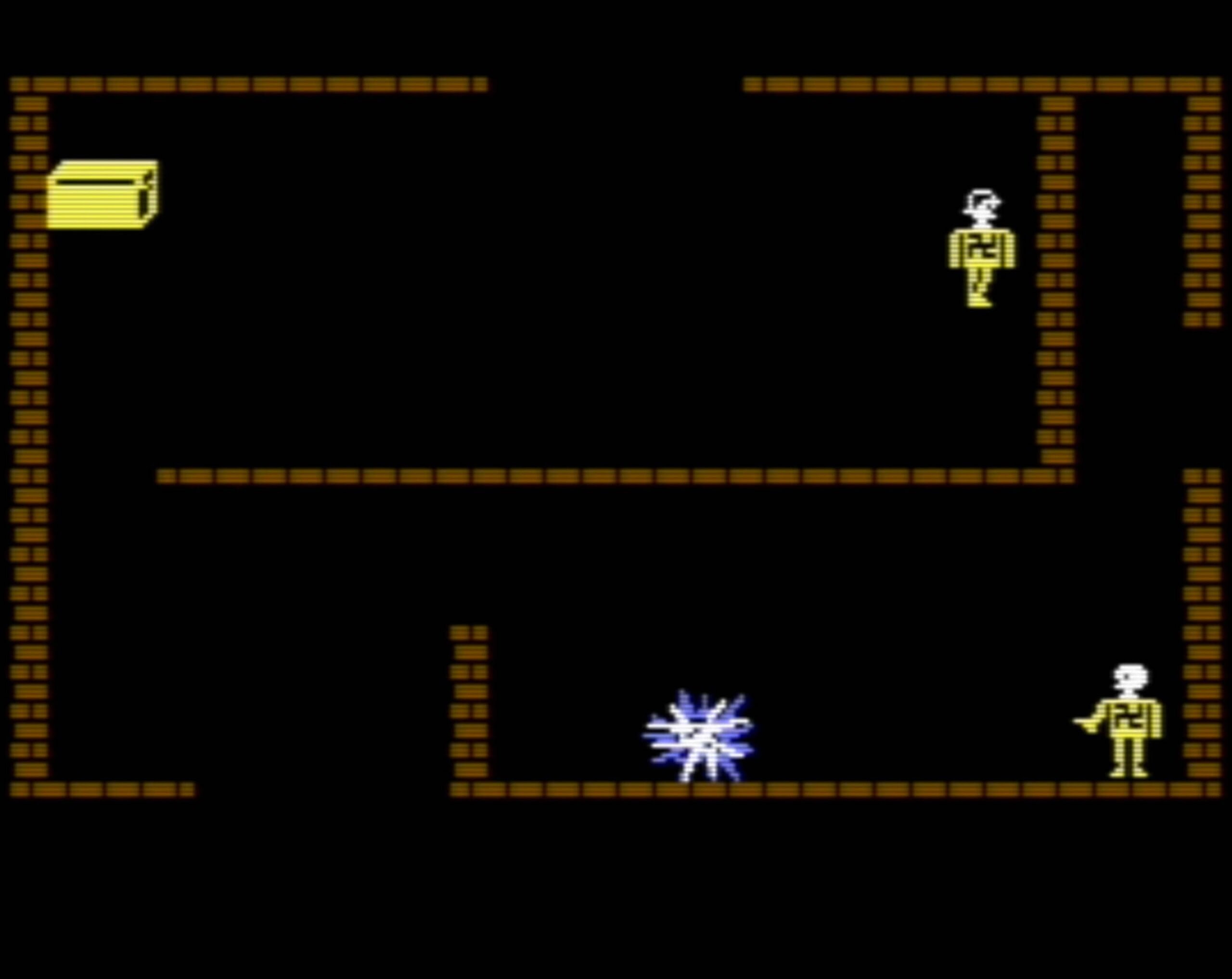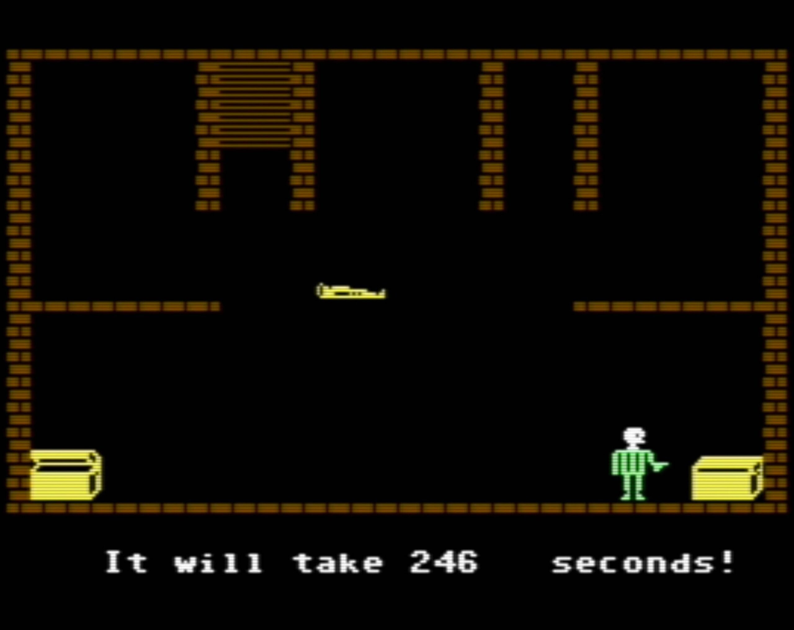 Vielä enemmän osittain kontrollien outous ehkä selittyy sillä, että Warner tuntuu olleen maailmaan ensimmäinen viba-koodari, joka on vain antanut palaa pohtimatta sen suuremmin, kannattaisiko — tai edes pitäisikö. Otetaan vaikka se huoneita täplittävien arkkujen tutkiminen. Pelaaja kävelee arkun viereen — mutta ei päälle, sillä jos pelaaja koskee seinää tai arkkuja, koko peli muuttuu psykedeeliseksi merkkisotkuksi ja ulinaksi — ja sitten painaa välilyönnin pohjaan, tietenkin samalla arkkua pistoolilla osoittaen. Ja sitten ruudulle paukahtaa ilmoitus, jonka mukaan arkun tonkiminen kestää 246 sekuntia.