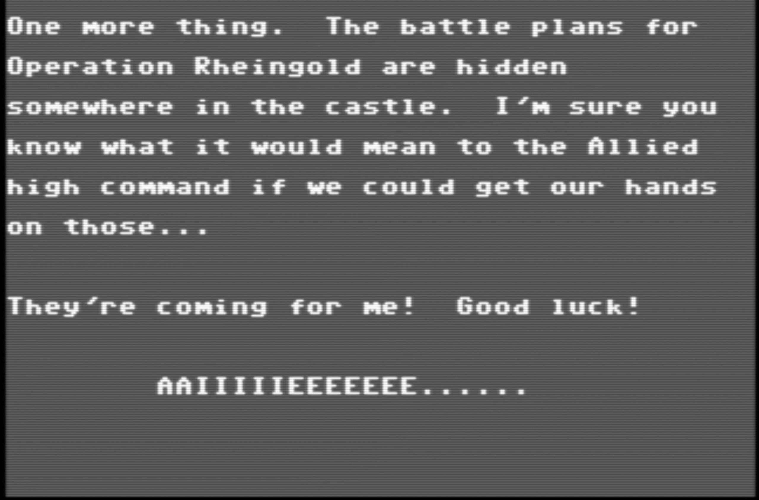 En itse vielä vuonna 1981 pelannut mitään omia varpaitani monimutkaisempaa, mutta muistan yhä elävästi, miten muutamaa vuotta myöhemmin waretin joltain kaverilta Castle Wolfensteinin Commodore 64 –version. Minua vielä muutamaa vuotta vanhempi kaveri hehkutti sitä älyttömästi ja pakkohan sitä oli pelata. Pelaaminen jäi kuitenkin hyvin hämmentyneeseen 10 minuutin sessioon, jonka aikana en saanut tehtyä yhtään mitään muuta kuin otettua pari askelta, minkä jälkeen natsi vangitsi minut.