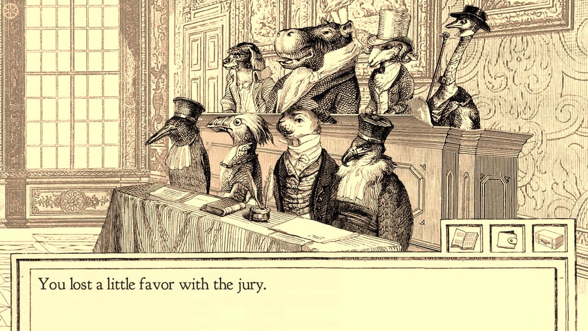 Unohtakaa pulusimulaattorit, sillä lintudekkari on nyt sitä kuuminta hottia. Pc:n tuore indienaksuttelu Aviary Attorney on valjastettu jo nettimeemeiksi asti, sekoittaahan se keskenään Phoenix Wrightista tutun oikeussalidraaman, 1840-luvun Ranskan ja astetta eläimellisemmän näkökulman. Antropomorfistinen Pariisi on jälleen yhden vallankumouksen partaalla, mutta kasvavat levottomuudet tuovat leivän jalohaukka Jayjay Falconin asianajotoimiston pöytään. Toistaitoinen Jayjay ja tämän yhtä höyhenaivoinen varpusapuri Sparrowson ajautuvatkin nopeasti koukeroisen oikeusjärjestelmän syvään päähän, mutta hahmojen nokkela sanailu pitää touhun hilpeänä.