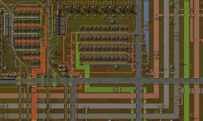 Tympeä käsityö on kuitenkin vain aloituspiste, sillä Factorio on peli tuotantolinjojen suunnittelusta ja optimoinnista sekä monimutkaisten automaattisten teollisuuskompleksien rakentamisesta. Pelatessa aukeava teknologiapuu tuo käyttöön kehittyneempiä ja nopeampia versioita raaka-aineiden louhintaan ja prosessointiin tarvittavista koneista, joiden tuotoksia pumpataan tehtaisiin jatkokehitystä varten.