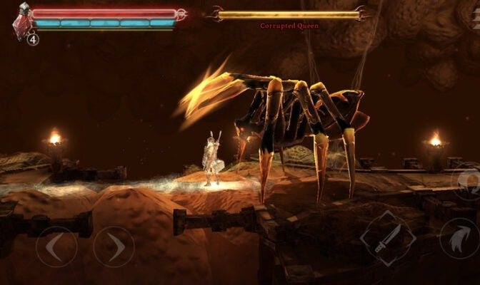 Grimvalor luottaa haasteen luomisessa liiaksi isoihin vihollismassoihin. Perusviholliset ja pomot antavat reilusti tilaa väistöille, mutta kun vastassa on lauma hämähäkkejä ja jousiampujia, tulee toiminnasta tukalaa. Periaatteessa tässä ei ole mitään vikaa, mutta ainakin puhelimen ruudulta oman hahmon erottaminen menee melkoiseksi tihrustamiseksi. Lisäksi ruuhkaisemmat kohtaukset tapaavat koetella suorituskykyä ainakin iPhone 7:llä, mikä hankaloittaa selviytymistä entisestään.