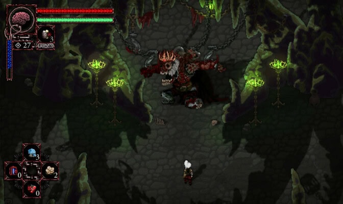 Valitettavasti tämän jälkeen alkavat ongelmat, sillä alkujaan kolmiulotteisen Bloodbornen muuntaminen isometriseksi 2D-peliksi ei ole onnistunut aivan täydellisesti. Maailman tutkiminen on kankeaa, koska pelialueesta näkee kerrallaan vain pienen palasen. Niinpä on usein hankala edes hahmottaa, missä päin kenttää liikkuu ja mitä ympärillä on.