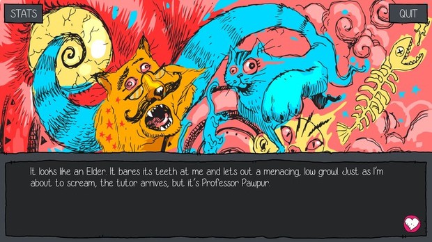 Tarina ja tapahtumat avautuvat hyvällä rytmityksellä, ja kaikissa hahmoissa on enemmän syvyyttä kuin aluksi voisi luulla. Villeimpinä hetkinään peli myös karkaa varsin happoisiin kuvioihin. Kissojen kanssa käytävissä henkilökohtaisissa keskusteluissa ja kohtauksissa on puolestaan hyvin aikuismainen maku, vaikka peli myös selkeästi tiedostaa, että koko sen idea on jo lähtökohtaisesti hyvin hassu.