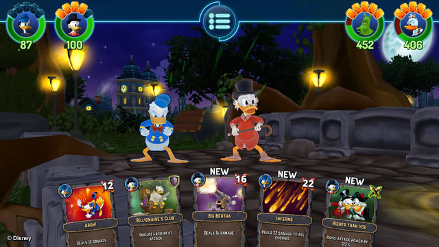 Jokaisella vuorolla voi pelata kolme korttia, jotka vaihtelevat voimanlisääjistä ja suojauksista erilaisiin hyökkäyksiin. Perustaistelu ei ole itse asiassa hassumpaa näin simppeliksi mätkeeksi. Koska pelaajan halutaan grindaavan hahmojensa kokemustasoja, vihollisten teho nousee paljon hurjempaa tahtia kuin ankkojen voima. Kahden sankarin eteen voi pölähtää kolmen konnan kopla, jonka kaikilla jäsenillä on kolme kertaa enemmän kestoa ja kovemmat iskut kuin sankareilla. Jos vanhojen taistojen toistoa haluaa välttää, alitehoisilla sankareilla saa tehdä työtä hiki tiristen.