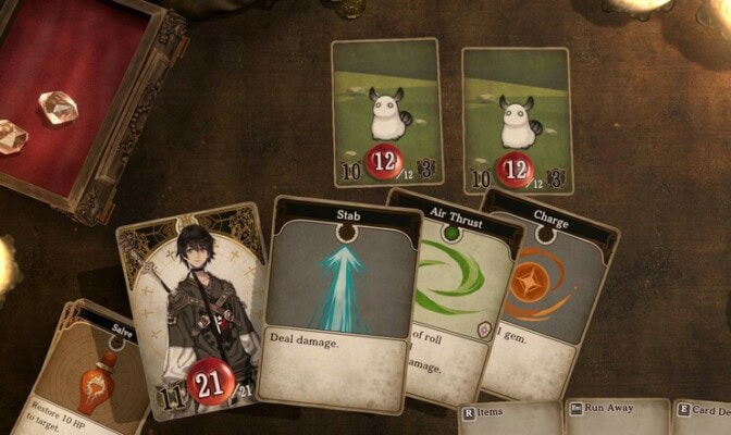 Satunnaiskohtaamisia vihollisten kanssa on aivan jatkuvasti, ja taistelut eivät ole millään muotoa haastavia mutta kylläkin aikaavieviä. Tämä on harmi, sillä taistelusysteemissäkin on ideaa kuin kepeässä korttipelissä konsanaan. Myös tyyli on hauska, sillä esimerkiksi erilaiset loitsuefektit ilmaistaan korttien päälle kiinnitettävillä tarroilla, mikä sai lautapelifanin sydämen sykkimään.