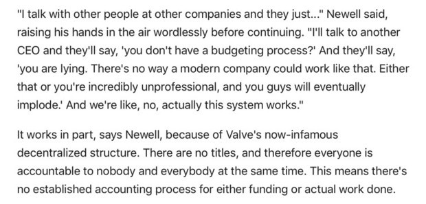 Kenties pysyviä ohjenuoria ei edes voisikaan olla – Valve on kuuluisa litteästä organisaatiostaan, mikä käytännössä tarkoittaa sitä että kukaan ei oikeastaan ole vastuussa kenellekään.