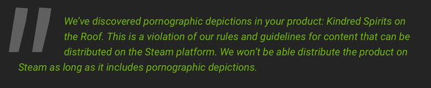 Hämmentävin tapaus on kuitenkin MangaGamerin julkaisema tyttörakkausteemainen visual novel Kindred Spirits on the Roof, jonka julkaisija MangaGamer sai myös samanlaisen viestin. Pelin Steam-julkaisu vuonna 2016 oli nimittäin laajasti otsikoissa, ja sitä pidettiin merkkinä siitä, että Valven suhtautuminen erotiikkaan oli lientymässä. (Olkoonkin, että sen seksikohtauksissa ei tosiaan näkynyt mitään nännejä kummempaa.)