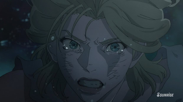 Gundam Thunderboltin avaruuskapteeni Claudia Peer itkemässä rakastajalleen, kun tietää joutuvansa käskemään kohta lisää sotilaita varmaan kuolemaan.
