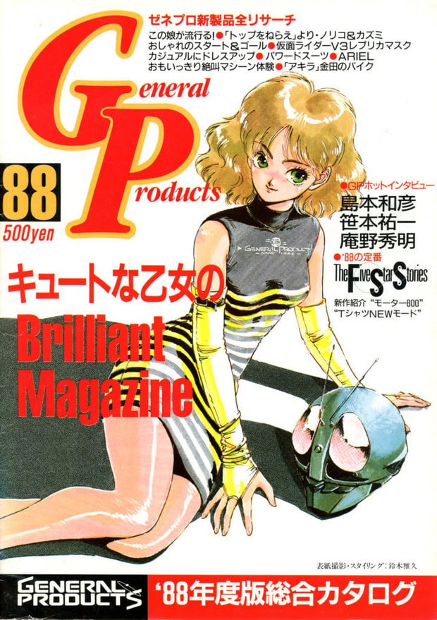 General Productsin tuotekatalogi vuodelta 1988. Sivuilla mainostettiin mm. yllä näkyviä Five Star Stories -metallipatsaita, Akira-moottoripyörän pienoismallia, Dragon Quest -miekkaa ja oikean kokoisia Kamen Rider -naamareita, jollainen näkyy myös kannessa.