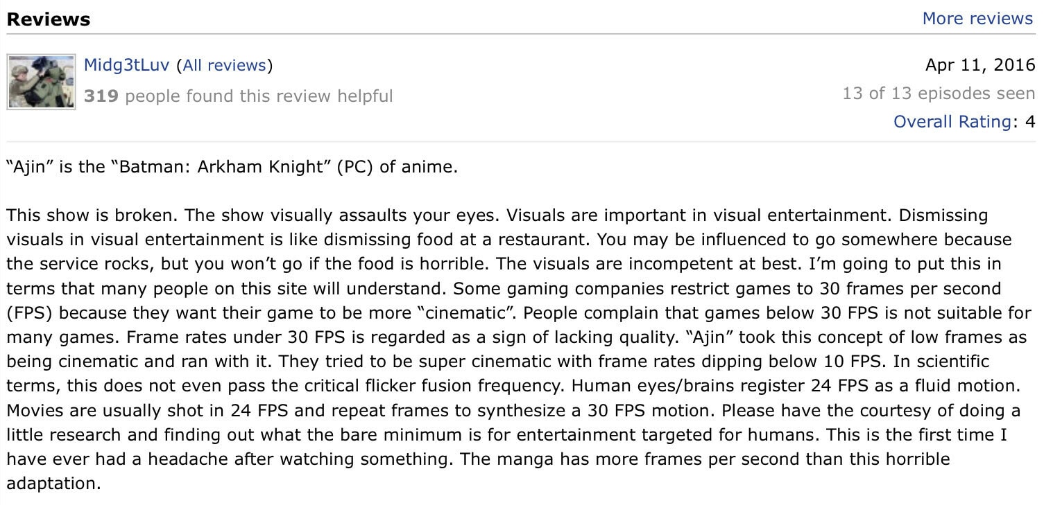 Tässä yllä olevassa postauksessa on puhe Ajinista, 3D-animaatiostudio Polygon Picturesin tuottamasta TV-sarjasta. Valitus koskee sitä, että 3D-toteutuksesta huolimatta sen animaation freimimäärää on keinotekoisesti laskettu alhaisemmaksi. Kirjoittajan oletus on, että se on tehty ”elokuvamaisuuden” luomiseksi.