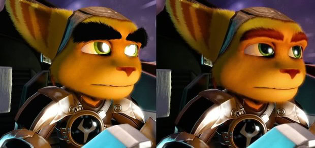 Mutta osataan sitä tietysti toiseenkin suuntaan. Toinen kuuluisa esimerkki on Ratchet & Clank -sarja, jossa Ratchetille on kansikuvien japanilaisissa versioissa lisätty paksut mustat kulmakarvat. Vuoden 2007 Tools of Destructionista alkaen kulmakarvat ovat löytyneet myös itse pelistä.
