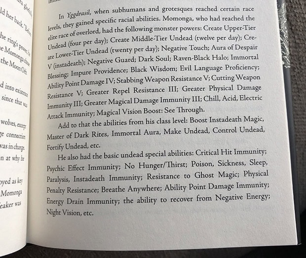 Ilmaus ”rare drop” on tietysti englantia, ja niin on suuri osa muustakin fantasia- ja pelitermistöstä. Fantasiamaailmoissa eleleviä tultasyökseviä liskoja ei kutsuta nimellä ”ryuu”, vaan ”dragon”. Hirviöt ylipäätään eivät ole ”bakemono”, vaan ”monster”. Tärkeät taikaesineet ovat ”itemejä”, kyvyt puolestaan ”skillejä”. Kun Overlordin päähenkilö käyttää loitsujaan, hän sanoo ääneen englanniksi ”Middle Cure Wounds” ja ”Summon Greater Undead”.