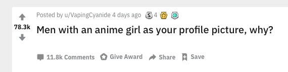 Se että puhe on nimenomaan animehahmoista on tässä oikeastaan vähän ylimääräinen sivujuonne. Mutta onhan se totta, että naishahmojen käyttäminen profiilikuvina on yleistä nimenomaan sellaisten ihmisten parissa, jotka kokevat olonsa kotoisaksi isosilmäisten piirroshahmojen parissa. Joten käsitellään se ensin alta pois.