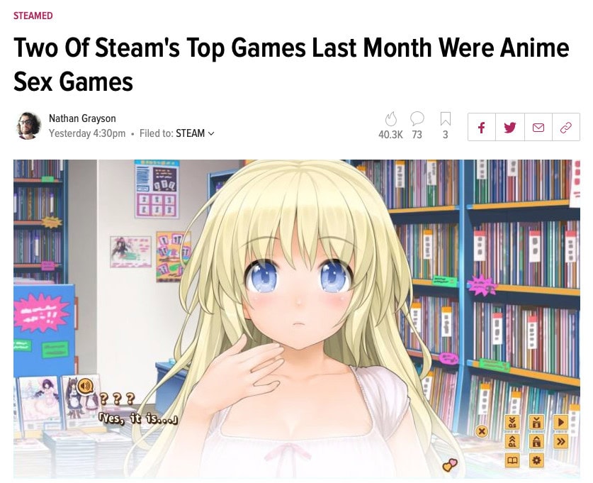 Ja jos on seurannut pelialan uutisointia, näin näyttäisi tosiaan tapahtuneen. Esimerkiksi Kotaku kirjoittelee säännöllisesti puritaanista päänpudisteluaan siitä, miten Steamin myydyimmät pelit ovat nykyään ”animeseksipelejä.” (Tällainen suhtautuminen erotiikkaa sisältävään tarinankerrontaan on toki ikävän lapsellista ja yksinkertaistavaa, kuten esimerkiksi tässä Pete Davisonin artikkelissa huomautetaan.)