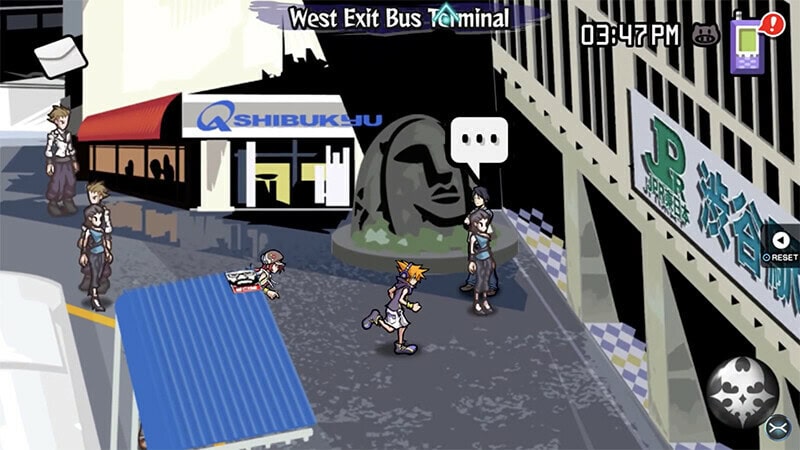 Siksi edellä mainitut kaupunginosat ovat miljoonille ihmisille arkisia ja tuttuja paikkoja, joten liika vapauksien ottaminen ei käy laatuun. Kauppojen ja rakennusten nimiä toki väännetään vähän – TWEWY:ssa Tower Records on ”Towa Records”, 109 on ”104”, Parco on ”Molco” ja O-East ”A-East”. Logot ja kyltit ovat kuitenkin selvästi tunnistettavissa samoiksi, koska pelimaailman on oltava riittävän tuttu oikeaan maailmaan verrattuna. Jos niin ei tehtäisi, miksi ylipäätään sijoittaa peli olemassaolevaan paikkaan eikä johonkin itse keksittyyn kaupunkiin?
