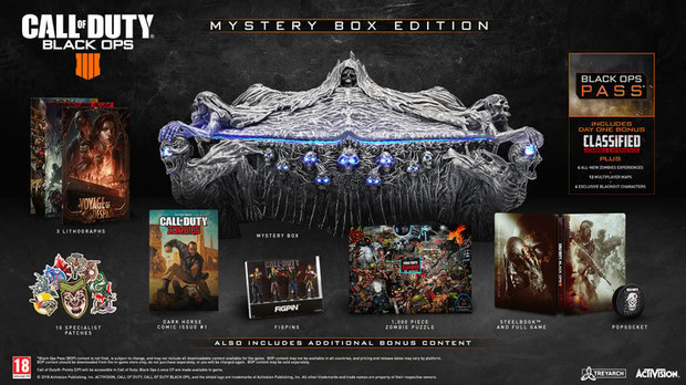 Mystery Box Edition pitää sisällään tietenkin itse pelin ja sen kausipassin, 1000 palan zombipalapelin, ensimmäisen numeron Dark Horse Comicin Call of Duty: Black Ops 4 Zombies -sarjakuvasta, kolme zombilitografiaa, zombiaiheisia hahmopinssejä, moninpelin spesialistien hihamerkkejä, Black Ops 4 -teemaisen kännykkäpidikkeen ja metallisen pelikotelon. Koko komeuden kruunaa zombiteemainen laatikko, joka on varustettu ääni- ja valoefekteillä!