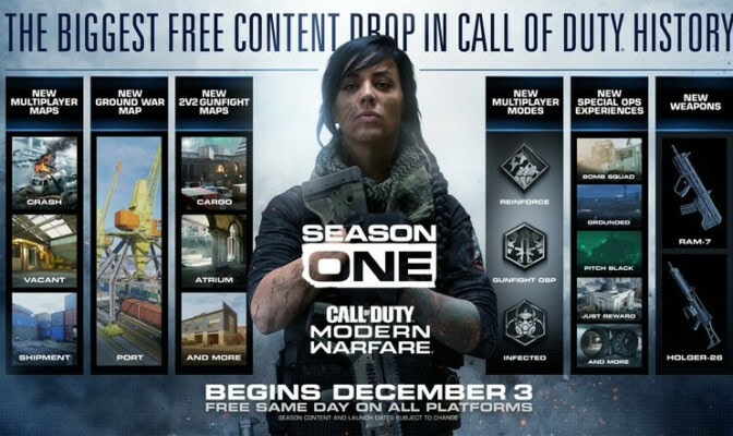 Lokakuussa julkaistun Call of Duty: Modern Warfaren ensimmäinen kausi tuo tullessaan julkaisijan mukaan pelisarjan historian suurimman ilmaisen sisältöjulkaisun. Kauden aikana julkaistavaan sisältöön kuuluu kolme perusmoninpelikarttaa, yksi Ground War -kartta, yli kaksi Gunfight-karttaa, neljä pelitilaa, kaksi asetta sekä vähintään neljä Spec Ops -yhteistyötehtävää.