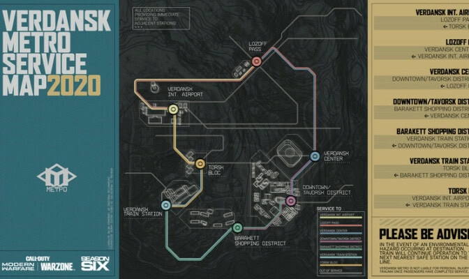 Infinity Ward on esitellyt Warzonen kuudennen kauden myötä saapuvaa metrojärjestelmää uudessa blogipäivityksessään. Metroa voi käyttää nopeaan liikkumiseen kaikkiaan seitsemän kiintopisteen yhteyteen sijoitetun aseman välillä. Kaikkien asemien rakenne on samanlainen: asemilla on ensin tasanne, josta rappukäytävät johtavat eri suuntiin vieville laitureille. Laiturit voivat sisältää myös varustelaatikoita tai takaisin maan pinnalle vievät pakotikkaat. Metro ei liiku taisteluiden aikana, joten asemataistelut on käytävä ennen seuraavalle asemalle siirtymistä. Metromatka tarjoaakin tilaisuuden esimerkiksi ladata aseet rauhassa ja vaihtaa varusteita tiimitoverien kanssa.